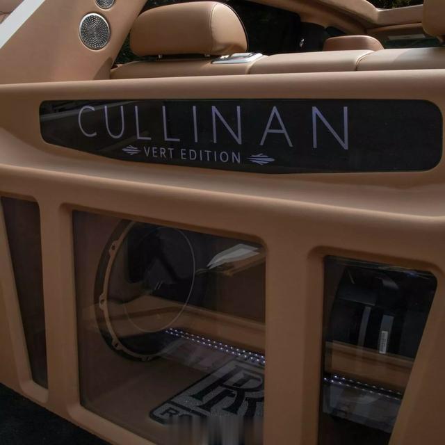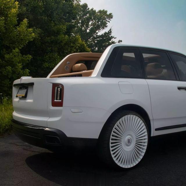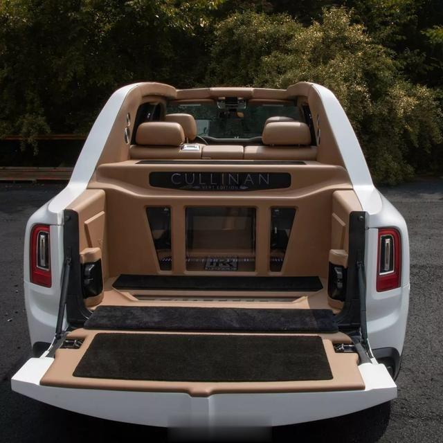 配色选用了纯白色车身,换上了一套超大的白色定制轮毂。车头的小飞人被贴满了钻石,这点很符合 Vert 的风格。彻底改造的敞篷车顶从前排一直延伸到后备箱,备箱中有超大的标牌“ Cullinan Vert Edition ”显示着这款独一无二的库里南,并配有专用的扬声器。除此之外内饰也进行了棕色皮革翻新,但很难想象它的质量能高于原厂的。#汽场全开##劳斯莱斯库里南#