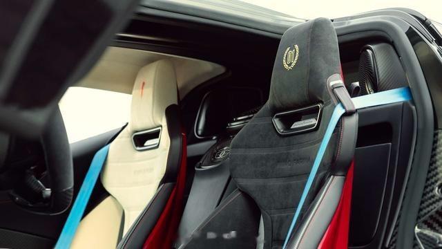 车内采用真皮内饰,驾驶员的座椅是黑色的,副驾驶的座椅是棕褐色,但在头枕上都带有特殊刺绣。车内采用了很多蓝色和红色的对比搭配,更不用说碳纤维和铝制材质了。由于这台车仅限量生产5台,每辆车都带有专属铭牌。因此,从严格意义上来讲,没有一台车是一模一样的。