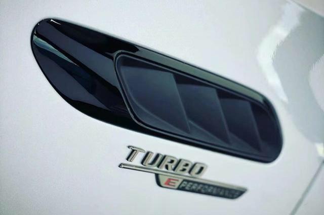 车身侧面配有“Turbo E Performance”标识,代表该车型使用了电动增压技术,可爆发出惊人的性能。车尾部分在后尾门上设计有鸭尾,排气口为梯形的双边四出样式,两侧排气口之间还配备了夸张的扩散器。