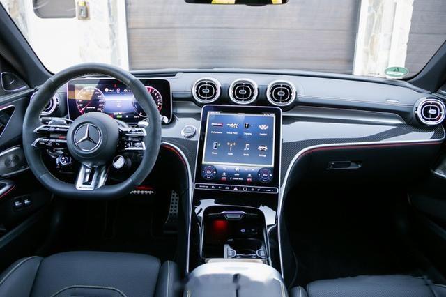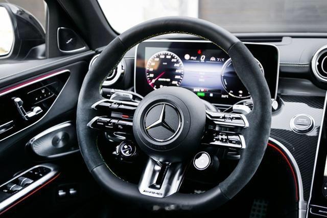 内饰方面,新款奔驰AMG C63搭载12.3英寸全液晶仪表盘+11.9英寸纵置中控屏,内置AMG车型专属的车机系统,搭配“蜻蜓”多功能方向盘以及经典的怀挡机构,方向盘上配备拨片及驾驶模式旋钮。