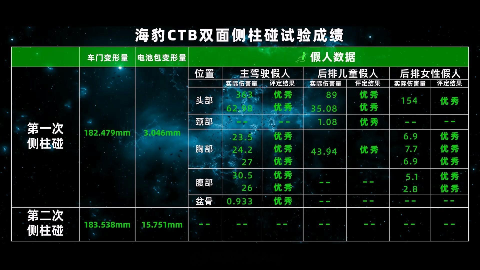 比亚迪海豹所采用的 CTB 技术在经过一次标准侧柱碰后,再次进行一次侧面柱碰。根据数据来看,第一次碰撞试验,比亚迪海豹整车以 32km/h 的速度和 75° 的角度,撞击 254mm 钢性柱,随后同一台车进行叠加第二次碰撞试验,以副驾驶后排撞击点进行侧柱碰试验。
