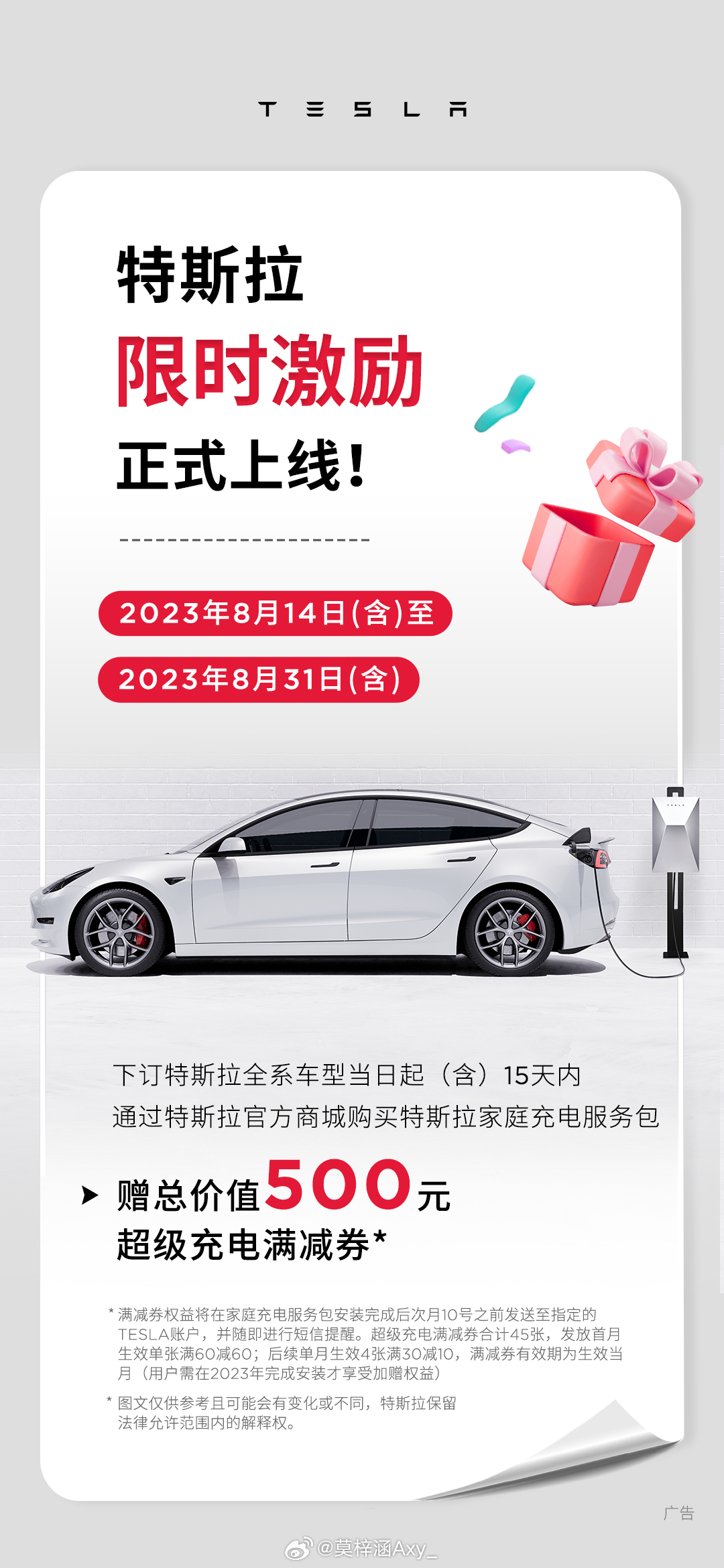 此外在8月14日-8月31日,下订特斯拉全系车型当日起(含)15天内通过特斯拉官方商城购买任意一款特斯拉家庭充电服务包,赠总价值500元超级充电满减券。#ModelY长续航及高性能版本降价##Model3限时保险补贴8000元##汽场全开#