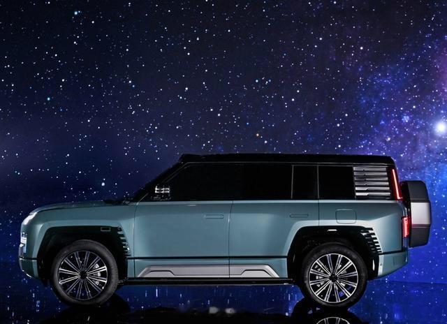 在车身侧面部分,线条非常凌厉,车顶配备行李架设计。前后轮眉有着明显外扩处理,显得非常硬朗。在车身尺寸方面,猛士917长宽高分别为4987/2080/1935毫米,轴距为2950毫米。