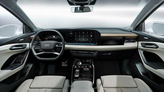 内饰设计上,Q6 e-tron提供了黑色与米白色两种配色,前者沉稳豪华,后者则散发出一种温暖的尊贵感。最引人注意的是其曲面双连屏,成为车内的视觉中心。而在副驾驶位前,还特设了一个娱乐显示屏。加之驾驶席前大型的HUD显示,技术氛围尽显。搭载11.9英寸的全景虚拟座舱和14.5英寸的奥迪MMI全景显示屏。