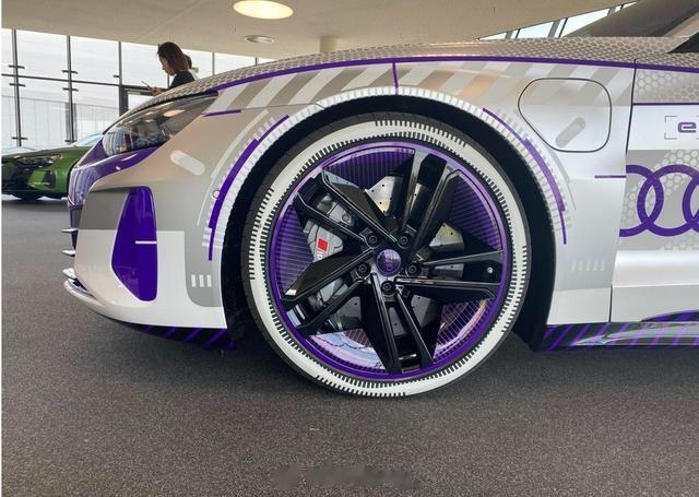 具体来看,新车底色由Florett silver银色搭建,并采用透明铝箔包裹,在底色之上奥迪增加了白色涂装,形成阴影效果,通过紫色的点缀,营造出冰雪的概念。此外,新车将搭载21英寸5辐式黑色轮圈,概念车上的轮圈并没有得以保留。