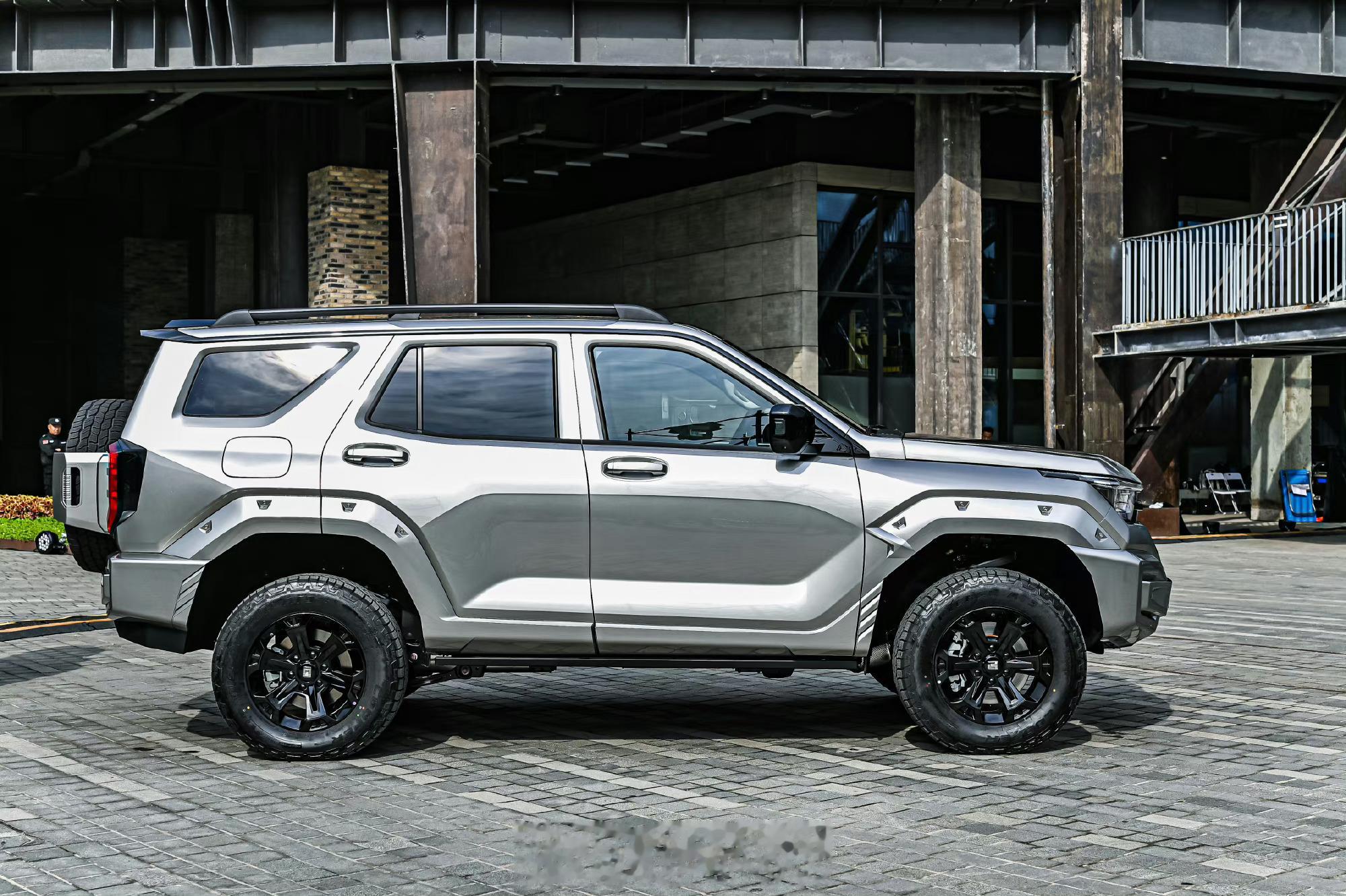 车身侧面姿态硬朗方正,腰线凌厉,勾勒出不错的光影立体效果,搭配铆钉轮眉和后挂式备胎,进一步提升野性气息。