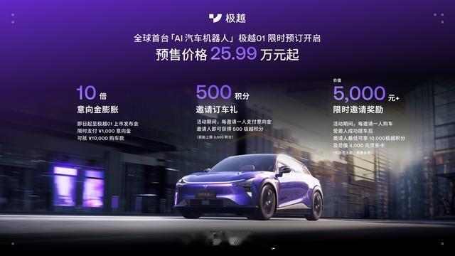 预售价25.99万元起 极越01将于10月上市!在车展现场,智美双全的极越01吸引了众多本地市民前来打卡体验,成为天津车展的智能汽车宠儿。极越01已正式开启预订,预售价25.99万元起。即日起至极越01上市发布前,用户通过极越APP或微信小程序下订,即可获得“头号玩家”身份,享受1000元意向金10倍订金膨胀,同时邀请好下订并成功提车后还可获得价值5000元限时礼(可无限叠加)等丰富权益。