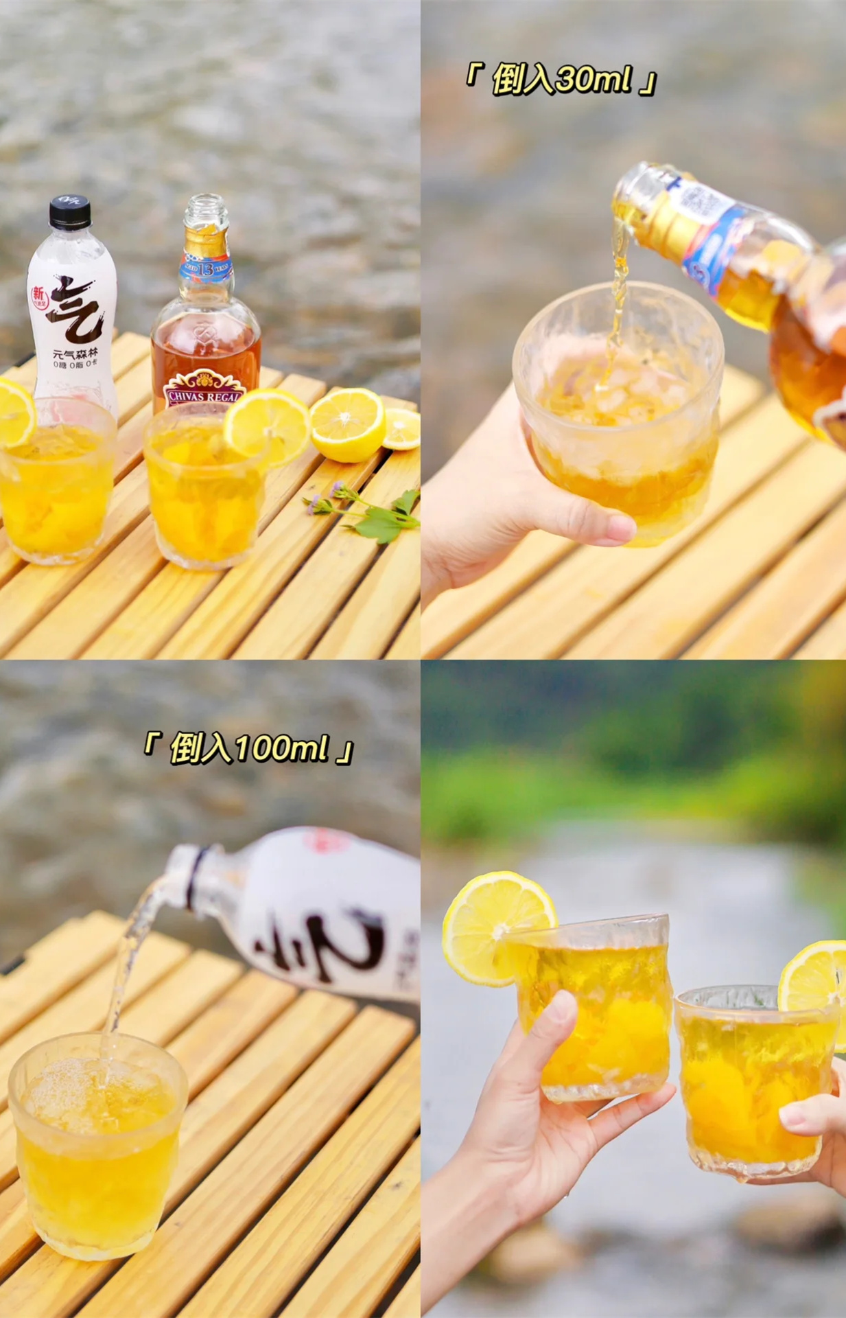 ❸ 这次溯溪露营,我们搞了点新意思,尝试做一回“调酒师”,往杯子里依次加入冰块,芝华士波本桶威士忌酒和元气森林气泡水,为了丰富口感,还特意加入了黄桃罐头果肉,自调的“鸡尾酒”整体喝起来很爽口。威士忌的口感很柔润,顺滑回味,搭配0糖0脂0卡的气泡水,清爽又get微醺的快乐,非常有夏天的味道