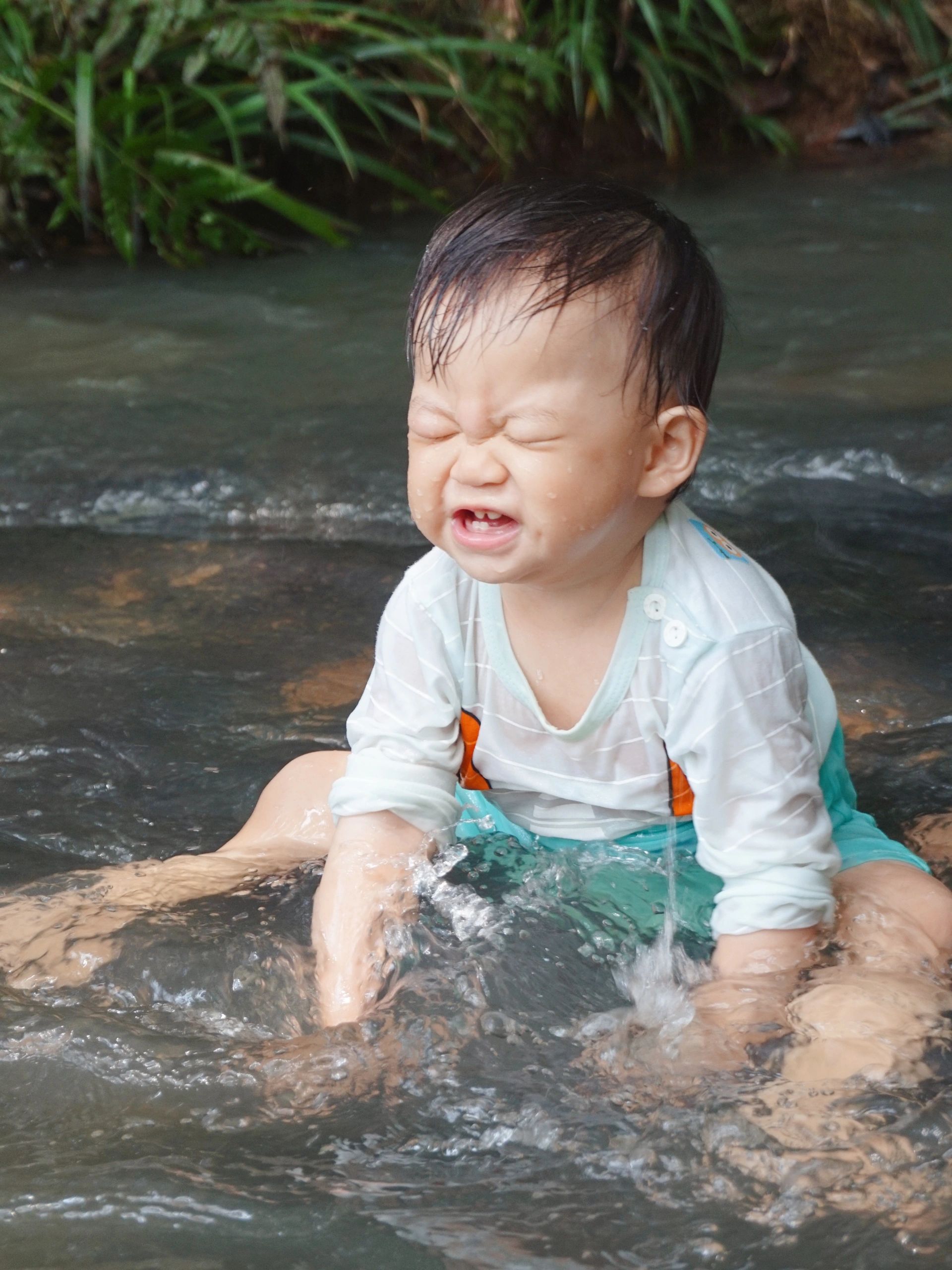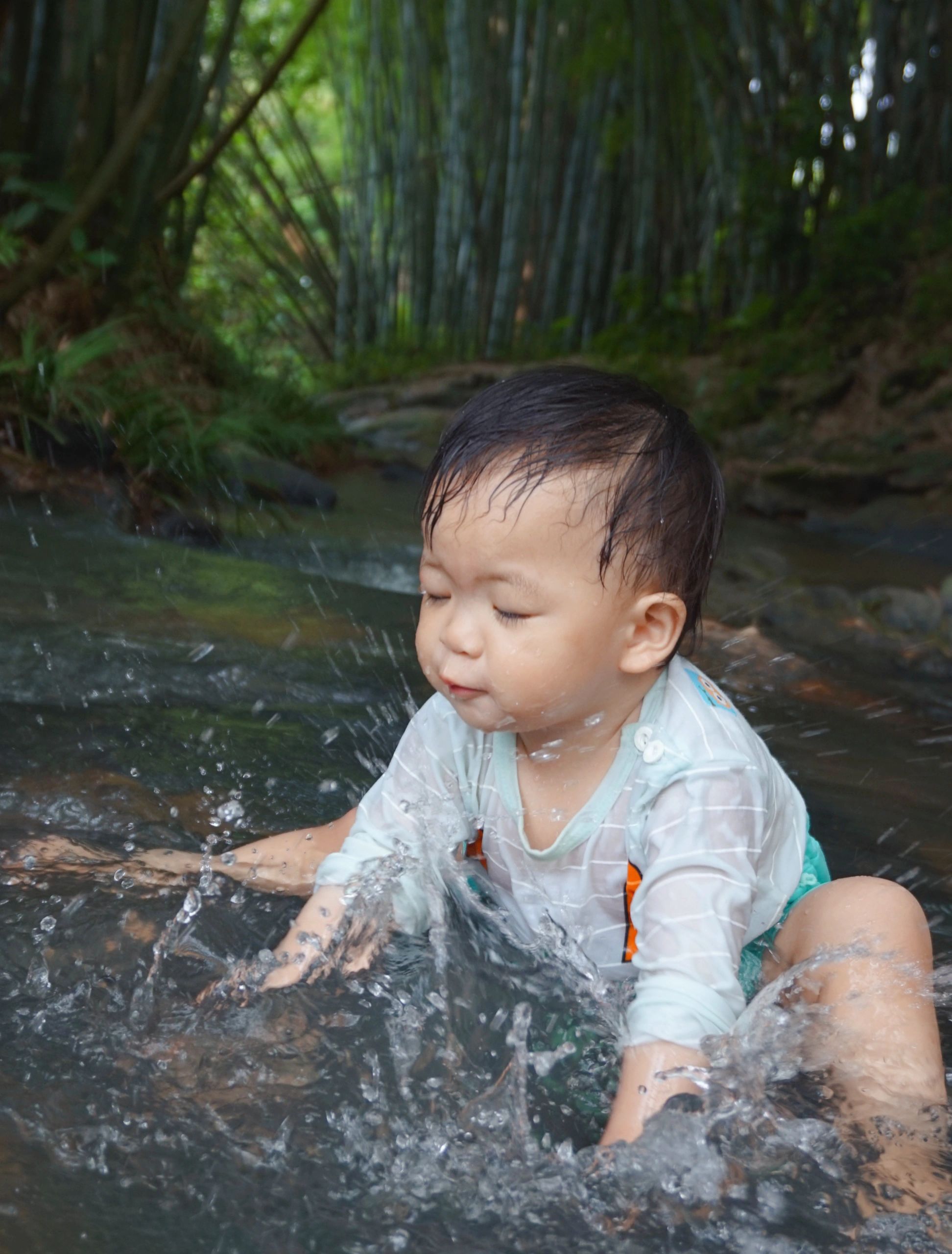 我家宝宝第一次进小溪玩,新奇得很,拉都拉不住,就径直坐下来拍水玩沙了。