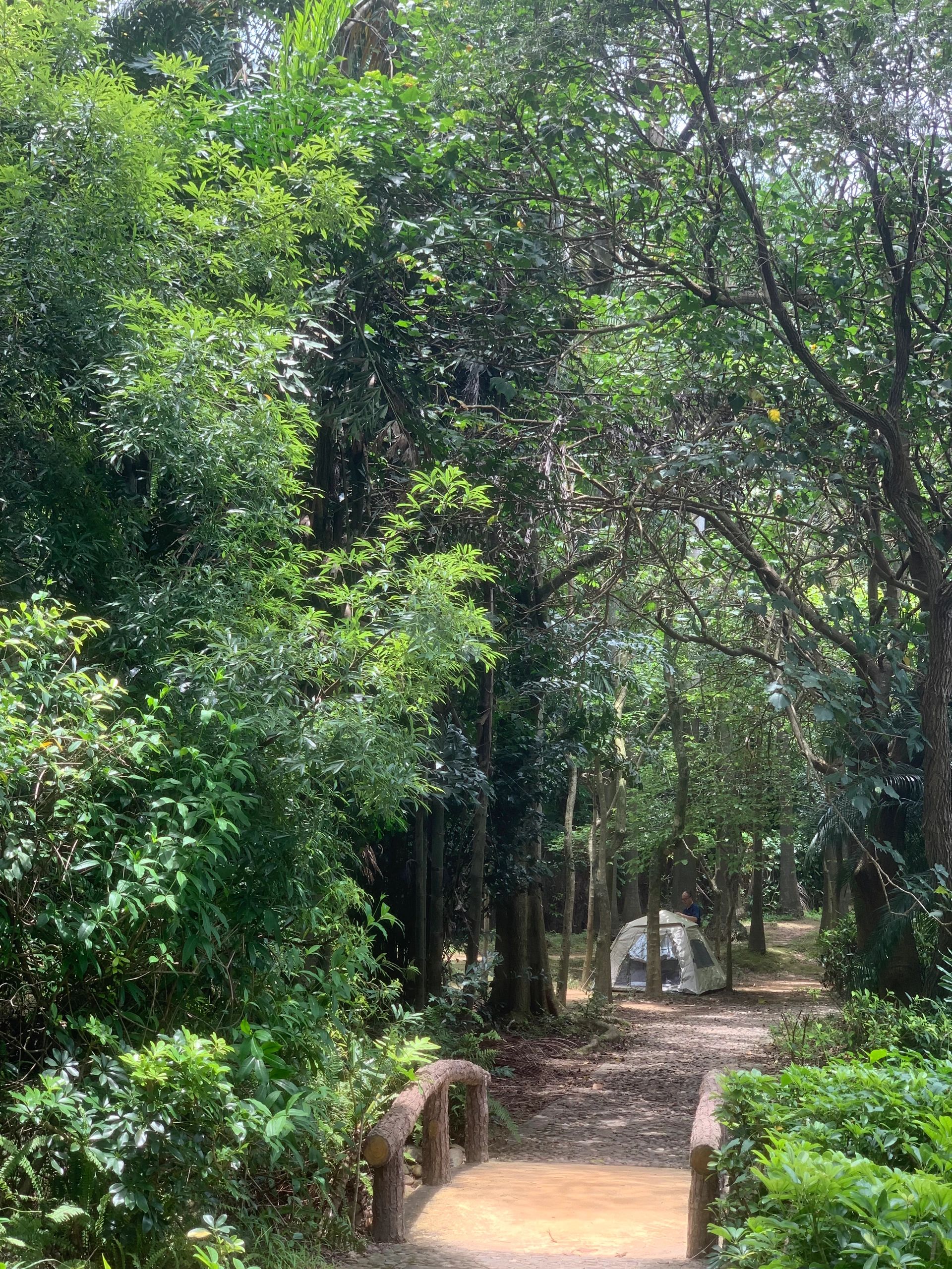 ⛺️露营:东门进去椰林那一段平坦地区可以搭帐篷野餐,我见有人绑吊床,树多还挺凉快,旁边有个小水沟也好多孩子在那里玩水呀!