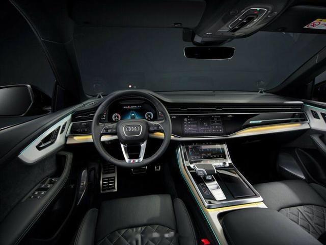 内饰部分,新款Q8配备了12.3英寸的数字仪表盘和10.1英寸的中控屏,中控屏下方还有一个8.6英寸的显示屏,用于控制空调、座椅通风等功能。其他配置包括真皮座椅加热、仿皮包裹的仪表面板、带电动调节的方向盘、三区空调控制系统、HomeLink和灰橡木装饰等。