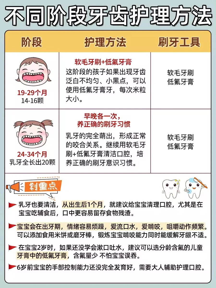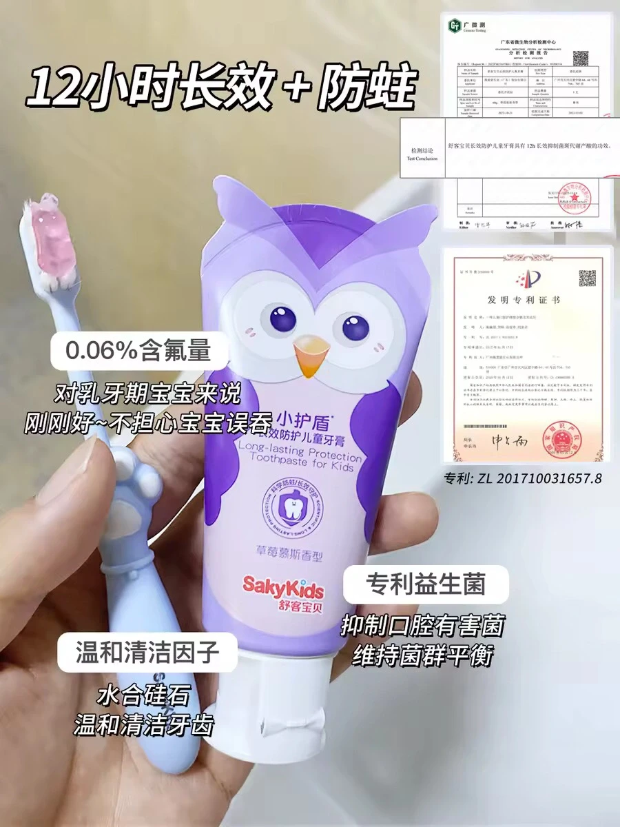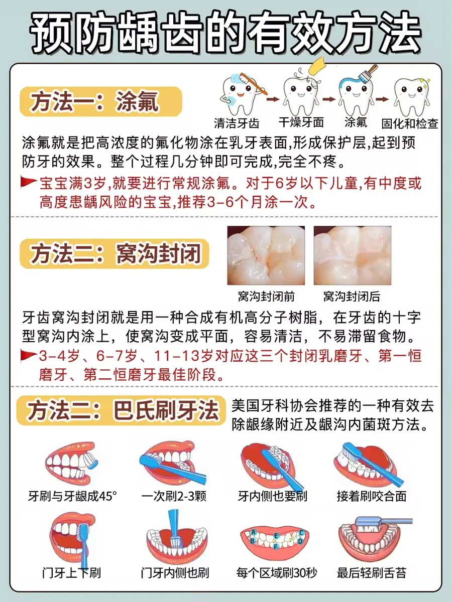 新手妈妈注意了,宝宝出生后口腔也要每天清洗!! 不然容易堆积奶渍,尤其吃辅食后食物残渣更容易留存口腔中‼️不同月龄宝宝口腔发育特点不同,要选取合适的清洗工具。这篇重点就跟大家聊聊怎么给不同阶段孩子清洁口腔,预防蛀🐛!! ⭕️宝宝不同阶段刷牙护理: ✅0-5个月(出牙前) 每天睡前用纱布牙刷轻轻擦拭宝宝牙床和舌苔上的奶渍,减少口腔细菌生长 ✅6-12个月(乳牙2-4颗) 用硅胶材质的指套牙刷,刷毛柔软,力度容易掌握,清洁的同时还能给牙床按摩 ✅9-16个月(乳牙6-8颗) 使用硅胶牙刷,在小牙齿上画圈,每个牙都要刷到 ✅16-27个月(乳牙10-12颗) 逐渐过渡到软毛牙刷,注意牙齿细缝要清洗到 ✅19-29个月(14-16颗) 这个阶段的孩子如果出现牙齿泛白不均匀、牙齿小黑点,可以使用低氟牙膏预防蛀牙,注意使用米粒大小即可。 🪥我家现在用的这款舒客宝贝益生菌儿童牙膏,含0.06%氟既能有效防蛀,又不担心宝宝误吞。是可以12小时长效防蛀的。里面含有专利益生菌(中国发明专利:ZL 201710031657.8),不仅可以对氟起到加固作用,还能快速覆盖吸附牙齿上的有害菌,在孩子刷牙漱口的时候就能打包带出口腔。 ✅24-34个月(20颗) 乳牙全部长出,继续用软毛牙刷+低氟牙膏清洁口腔,培养正确的刷牙意识习惯,早晚2次刷牙。 ⭕️预防龋齿的有效方法: 1️⃣正确刷牙:使用巴氏刷牙法,注意每次需要刷够两分钟,确保每个角落都刷到 2️⃣牙齿涂氟:这个方法适合3岁及以上的孩子,这时候乳牙已经出齐了,定期涂氟,可以起到保护牙釉质和预防龋齿的作用 3️⃣窝沟封闭:通过在牙齿的窝沟表面涂覆一层特殊的树脂材料,封闭后可以阻止细菌及食物残渣进入窝沟,从而减少龋齿的发生。 🚩正确刷牙、牙齿涂氟和窝沟封闭对防护龋齿都有一定的好处,但正确刷牙是婴幼儿预防龋齿的第一步。 ⭕️宝宝牙膏如何选择? ✔️重点了解氟化物、摩擦剂、甜味剂等成分。 如果妈妈们不想做功课,可以试试我家用的同款舒客宝贝益生菌儿童牙膏。舒客宝贝也是专注儿童口腔护理十几年的国货大牌了。味道是淡淡的草莓慕斯味,宝宝接受度高~ 篇幅有限,具体看上面的图片!