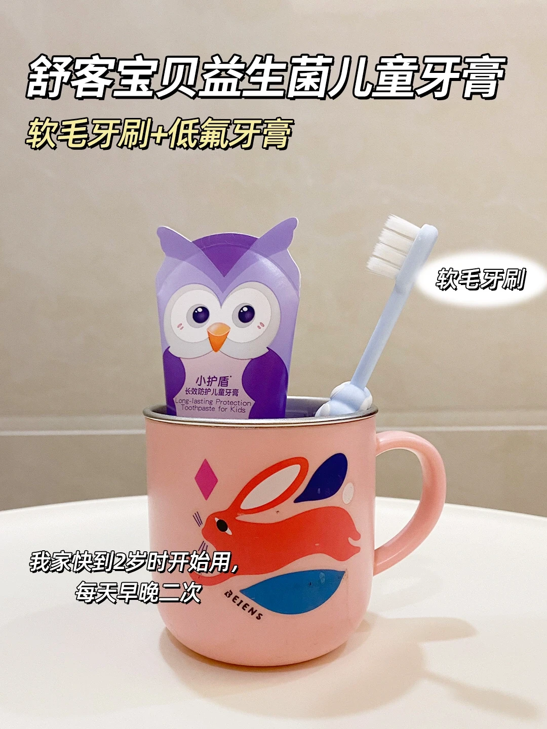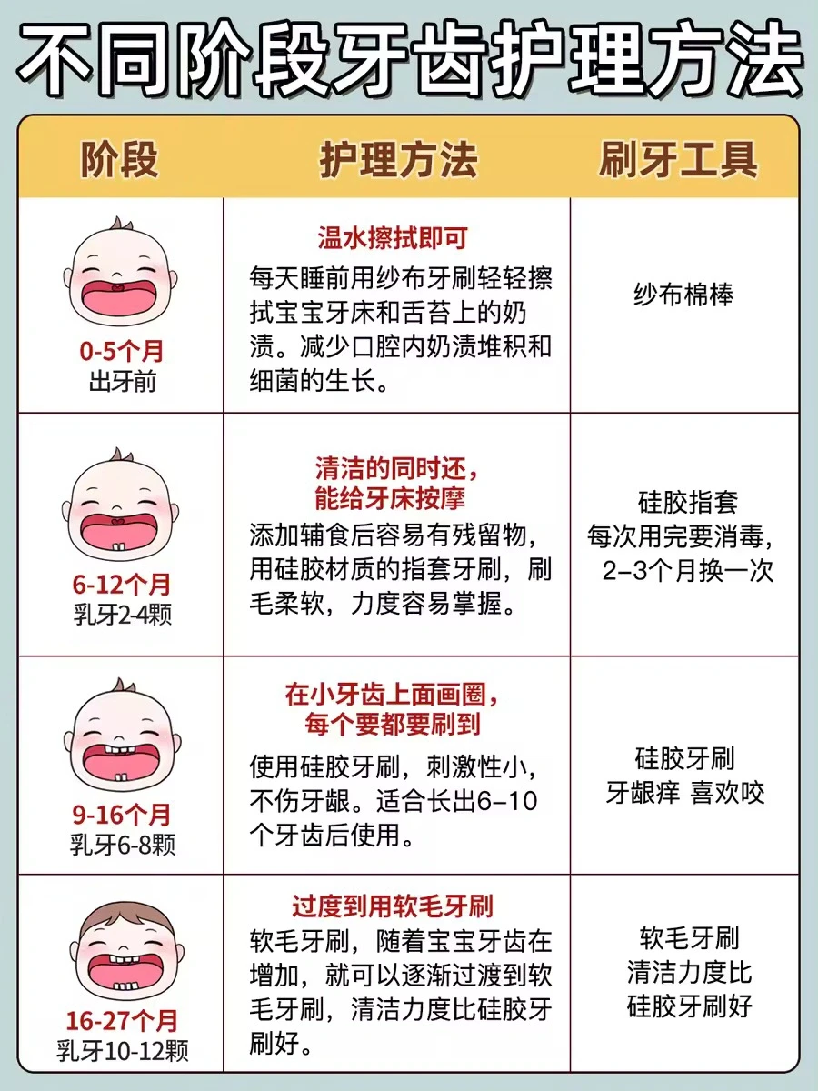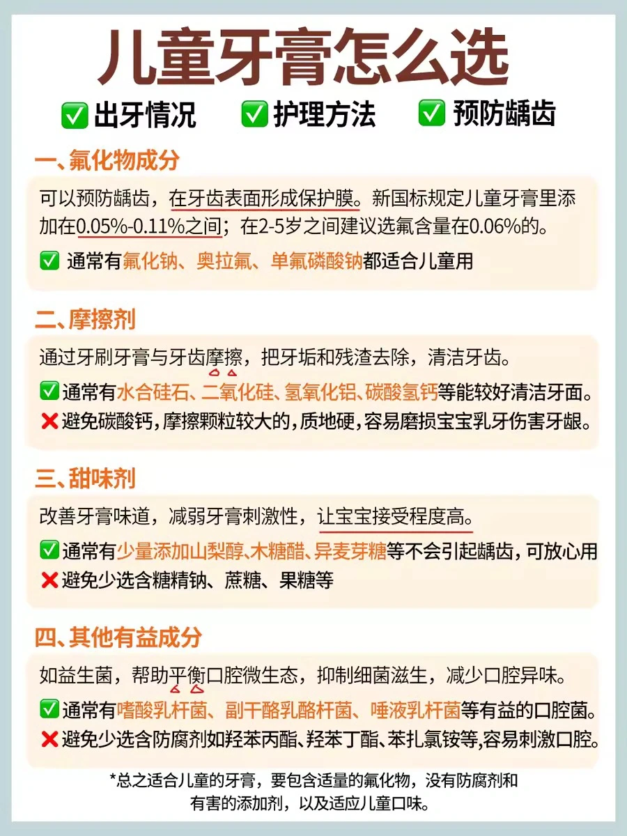 新手妈妈注意了,宝宝出生后口腔也要每天清洗!! 不然容易堆积奶渍,尤其吃辅食后食物残渣更容易留存口腔中‼️不同月龄宝宝口腔发育特点不同,要选取合适的清洗工具。这篇重点就跟大家聊聊怎么给不同阶段孩子清洁口腔,预防蛀🐛!! ⭕️宝宝不同阶段刷牙护理: ✅0-5个月(出牙前) 每天睡前用纱布牙刷轻轻擦拭宝宝牙床和舌苔上的奶渍,减少口腔细菌生长 ✅6-12个月(乳牙2-4颗) 用硅胶材质的指套牙刷,刷毛柔软,力度容易掌握,清洁的同时还能给牙床按摩 ✅9-16个月(乳牙6-8颗) 使用硅胶牙刷,在小牙齿上画圈,每个牙都要刷到 ✅16-27个月(乳牙10-12颗) 逐渐过渡到软毛牙刷,注意牙齿细缝要清洗到 ✅19-29个月(14-16颗) 这个阶段的孩子如果出现牙齿泛白不均匀、牙齿小黑点,可以使用低氟牙膏预防蛀牙,注意使用米粒大小即可。 🪥我家现在用的这款舒客宝贝益生菌儿童牙膏,含0.06%氟既能有效防蛀,又不担心宝宝误吞。是可以12小时长效防蛀的。里面含有专利益生菌(中国发明专利:ZL 201710031657.8),不仅可以对氟起到加固作用,还能快速覆盖吸附牙齿上的有害菌,在孩子刷牙漱口的时候就能打包带出口腔。 ✅24-34个月(20颗) 乳牙全部长出,继续用软毛牙刷+低氟牙膏清洁口腔,培养正确的刷牙意识习惯,早晚2次刷牙。 ⭕️预防龋齿的有效方法: 1️⃣正确刷牙:使用巴氏刷牙法,注意每次需要刷够两分钟,确保每个角落都刷到 2️⃣牙齿涂氟:这个方法适合3岁及以上的孩子,这时候乳牙已经出齐了,定期涂氟,可以起到保护牙釉质和预防龋齿的作用 3️⃣窝沟封闭:通过在牙齿的窝沟表面涂覆一层特殊的树脂材料,封闭后可以阻止细菌及食物残渣进入窝沟,从而减少龋齿的发生。 🚩正确刷牙、牙齿涂氟和窝沟封闭对防护龋齿都有一定的好处,但正确刷牙是婴幼儿预防龋齿的第一步。 ⭕️宝宝牙膏如何选择? ✔️重点了解氟化物、摩擦剂、甜味剂等成分。 如果妈妈们不想做功课,可以试试我家用的同款舒客宝贝益生菌儿童牙膏。舒客宝贝也是专注儿童口腔护理十几年的国货大牌了。味道是淡淡的草莓慕斯味,宝宝接受度高~ 篇幅有限,具体看上面的图片!
