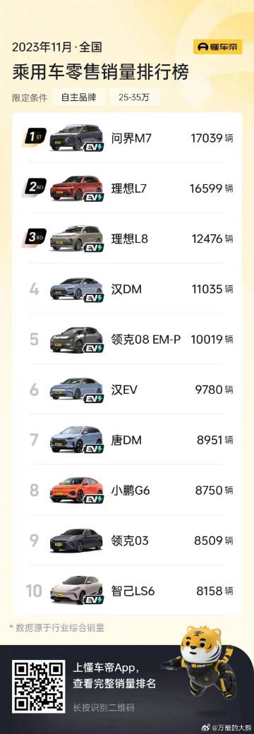 请注意标题用词,应该说国产25-35万的电动7座SUV在汽车之家销售的排名!