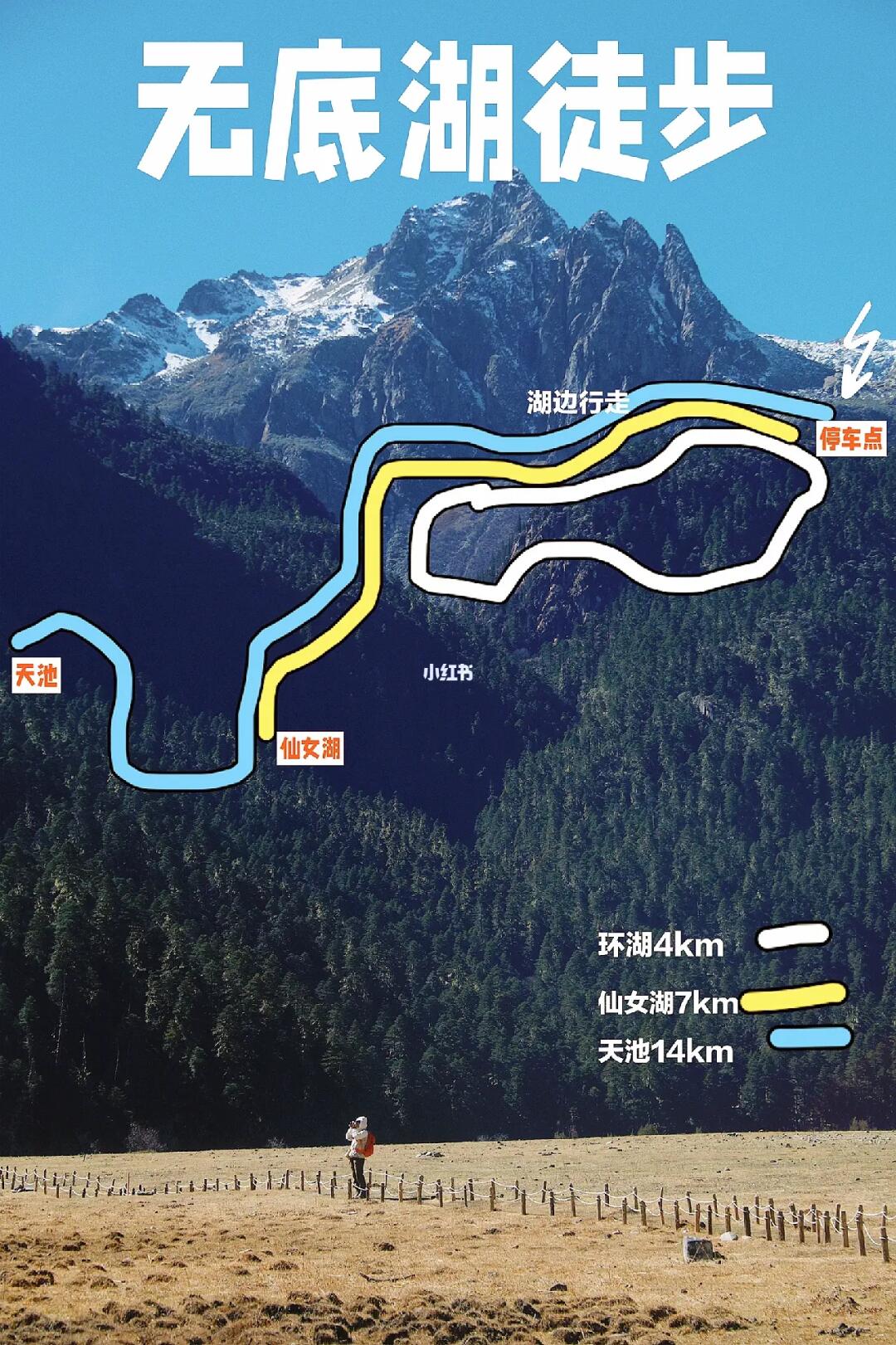 ❷无底湖 - 仙女湖 ,原路折返约7km,海拔4000-4200m,轻微爬升,有一定运动量,可以俯瞰无底湖。