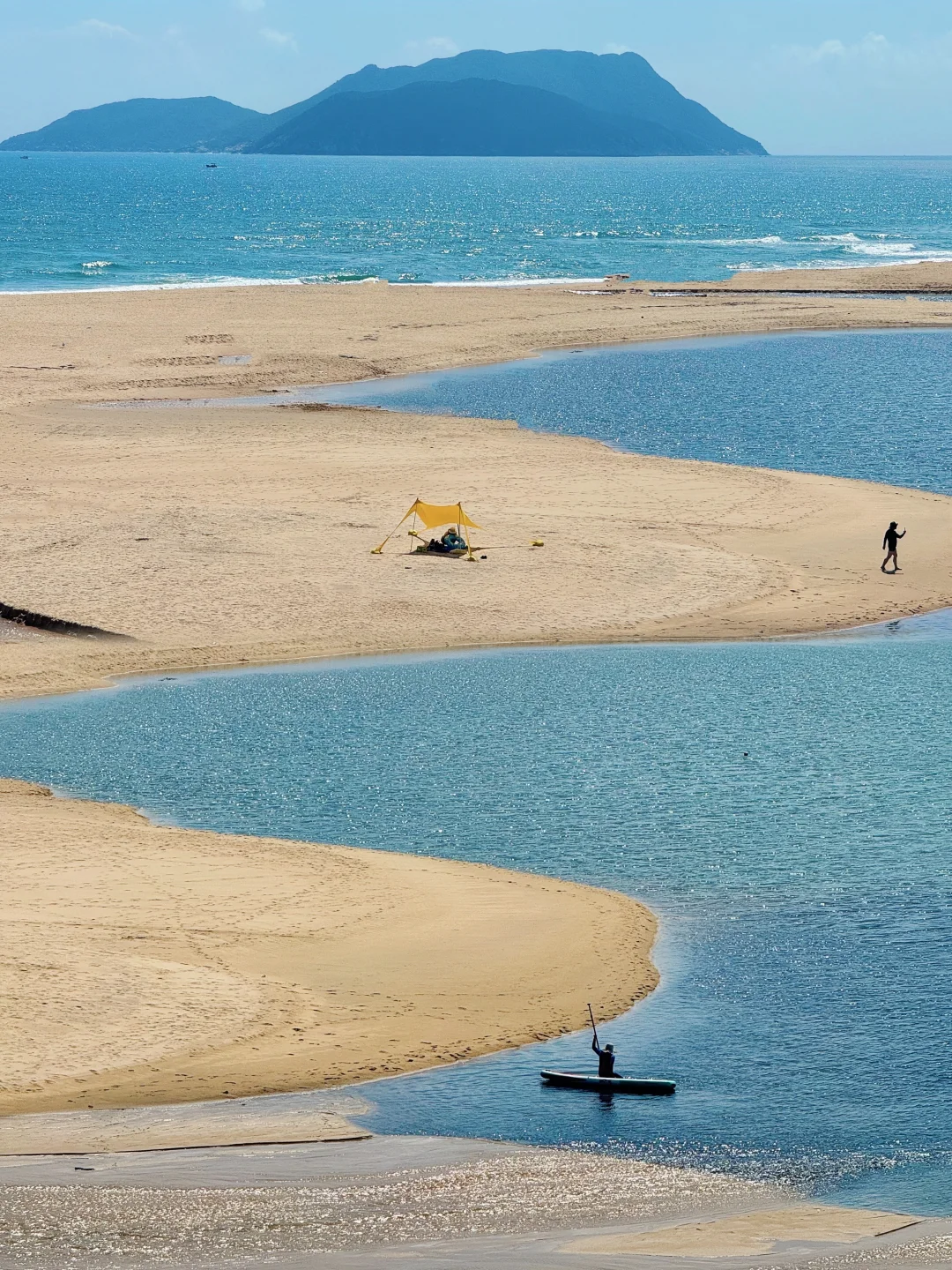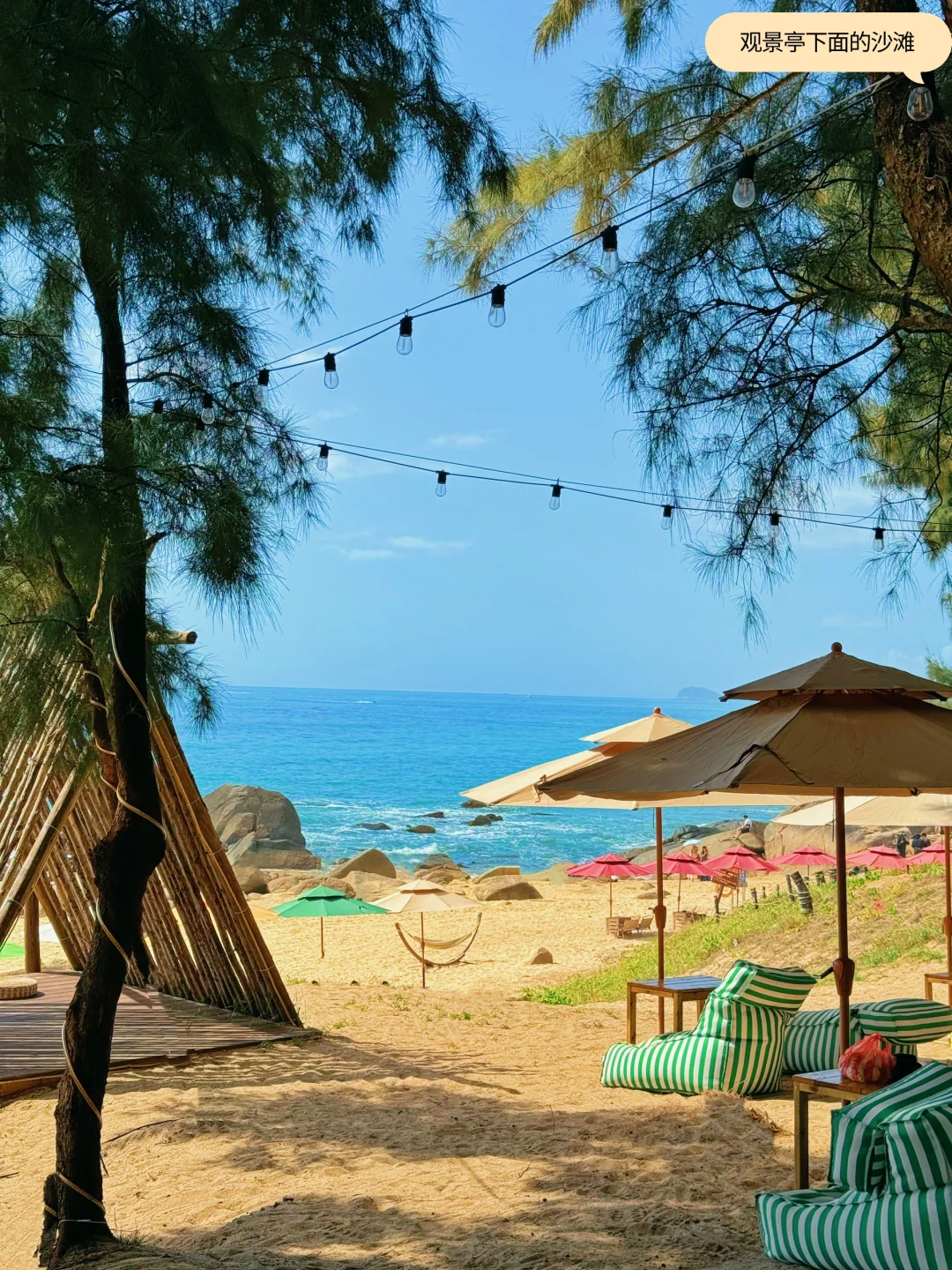 到达观景亭,亭子的西边50米,有条下海滩的路。顺这片沙滩继续往西走200米,就可以到艾美酒店后面的沙滩。这片沙滩人稍微多一点,但是是玻璃海色,里面有个营地拍照很美。