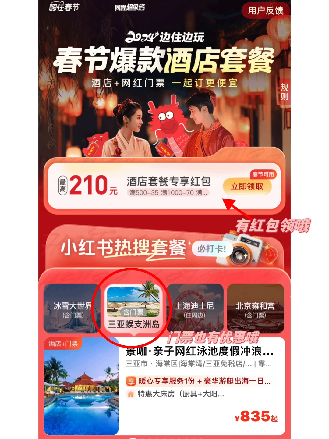✅每年春节都带家人在海口或者万宁过节,年后准备再去趟三亚,旅行住宿就在同程酒店上提前预订,同程旅行XC序🔍【过吉祥年】,有热门目的地的酒店🏨+门票🎟套餐,三亚蜈支洲岛门票和酒店套餐也有哦,比单买划算,有些套餐还有豪华游艇一日游呢~