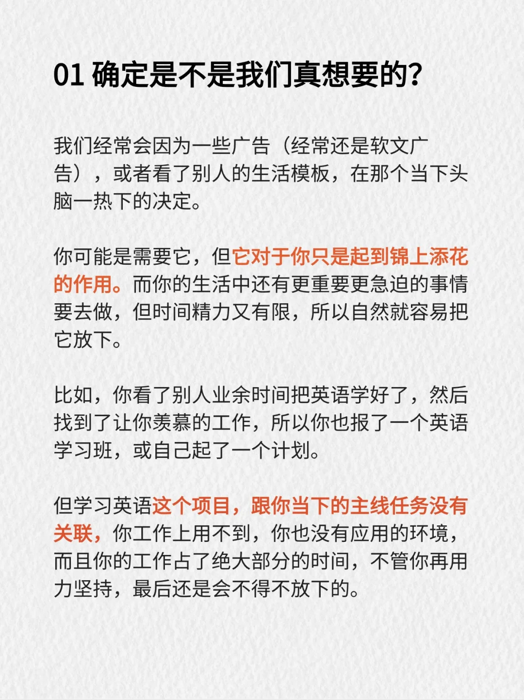 但学习英语这个项目,跟你当下的主线任务没有关联,你工作上用不到,你也没有应用的环境,而且你的工作占了绝大部分的时间,不管你再用力坚持,最后还是会不得不放下的。