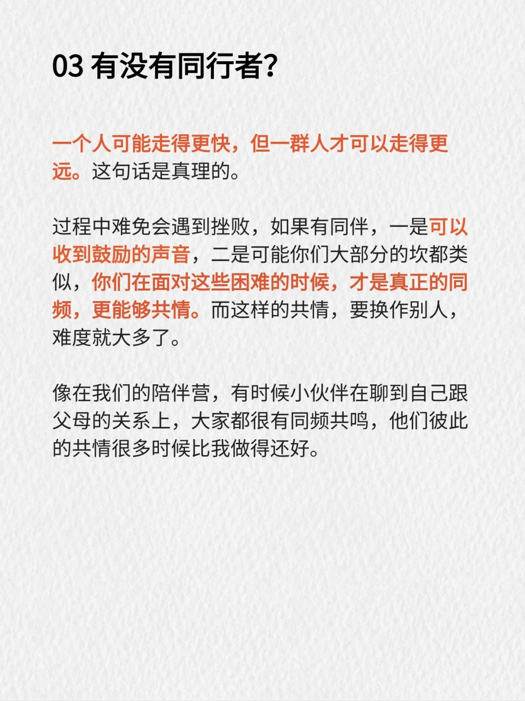 过程中难免会遇到挫败,如果有同伴,一是可以收到鼓励的声音,二是可能你们大部分的坎都类似,你们在面对这些困难的时候,才是真正的同频,更能够共情。而这样的共情,要换作别人,难度就大多了。