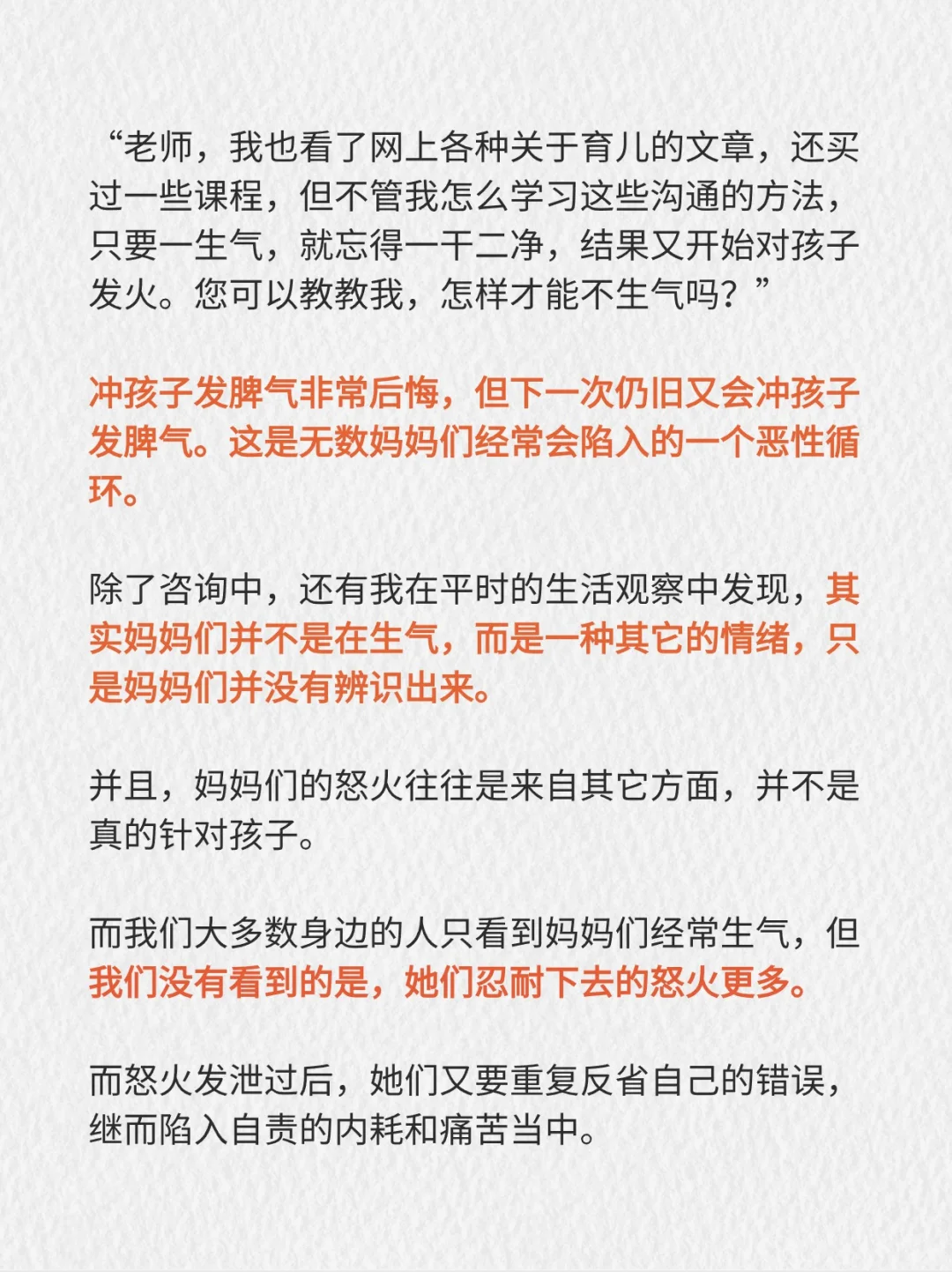 💁“老师,我也看了网上各种关于育儿的文章,还买过一些课程,但不管我怎么学习这些沟通的方法,只要一生气,就忘得一干二净,结果又开始对孩子发火。您可以教教我,怎样才能不生气吗?”