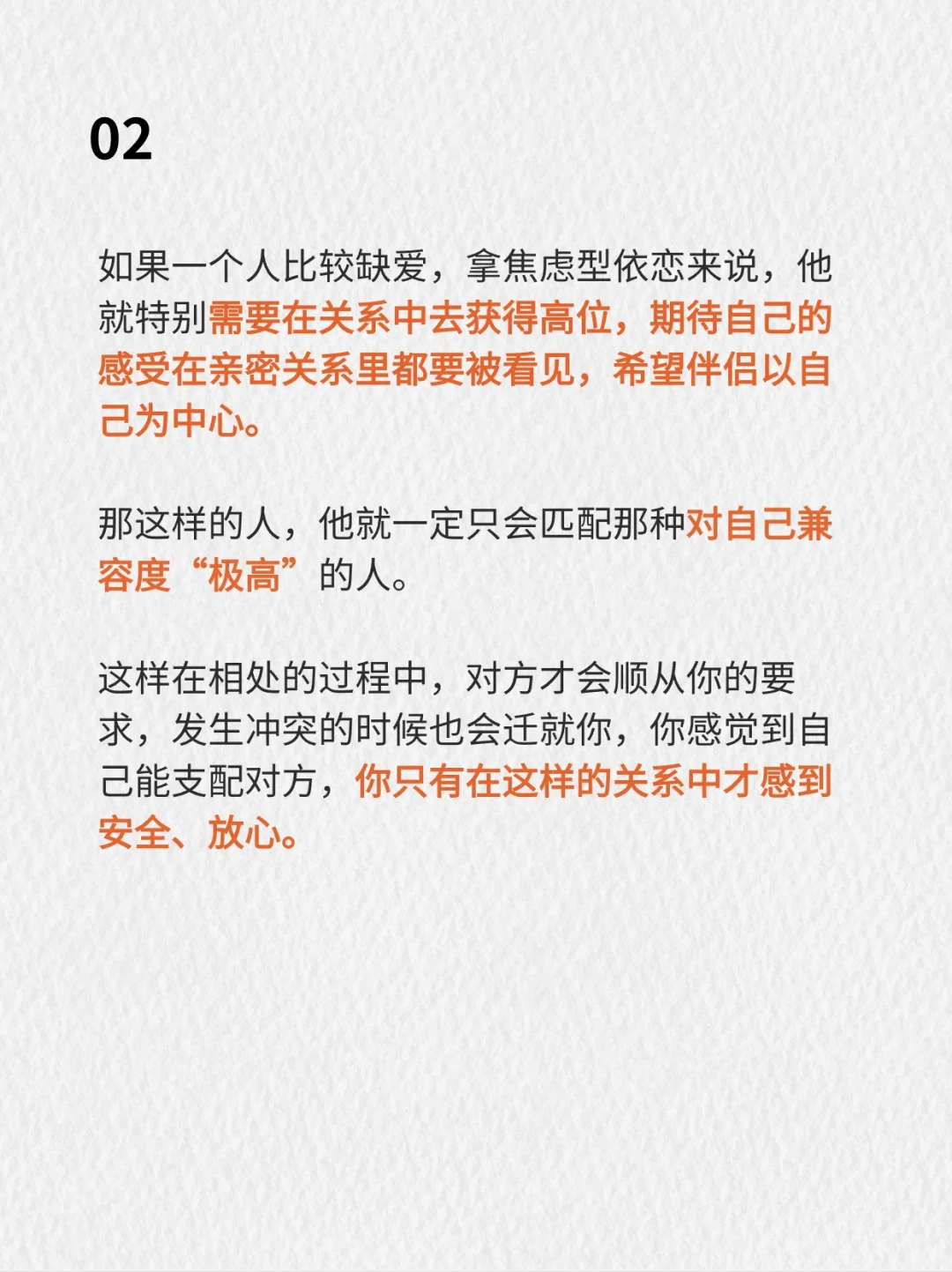 如果一个人比较缺爱,拿焦虑型依恋来说,他就特别需要在关系中去获得高位,期待自己的感受在亲密关系里都要被看见,希望伴侣以自己为中心。