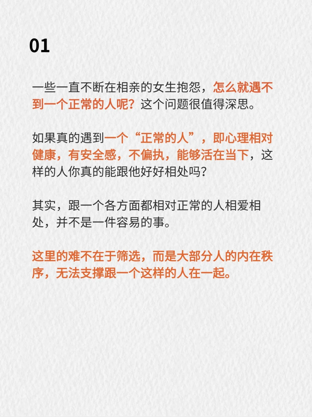一些一直不断在相亲的女生抱怨,怎么就遇不到一个正常的人呢?这个问题很值得深思。