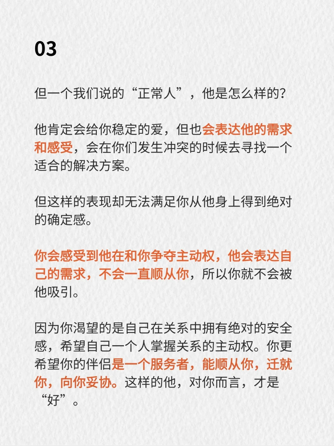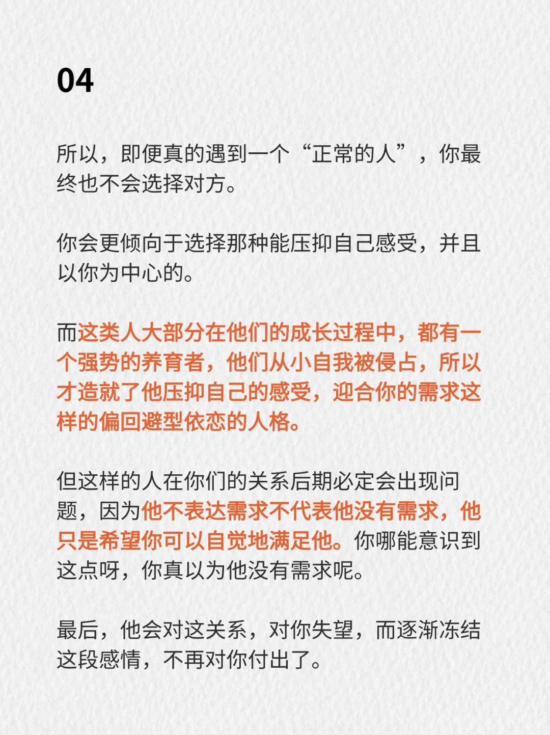 而这类人大部分在他们的成长过程中,都有一个强势的养育者,他们从小自我被侵占,所以才造就了他压抑自己的感受,迎合你的需求这样的偏回避型依恋。