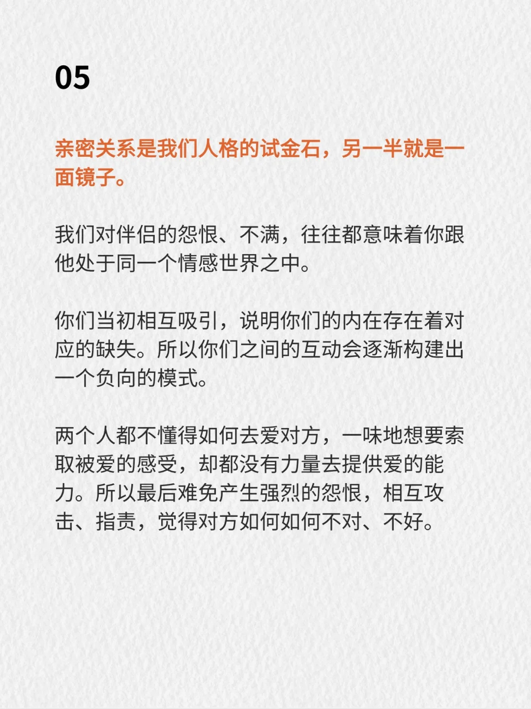我们对伴侣的怨恨、不满,往往都意味着你跟他处于同一个情感世界之中。你们当初相互吸引,说明你们的内在存在着对应的缺失。所以你们之间的互动会逐渐构建出一个负向的模式。