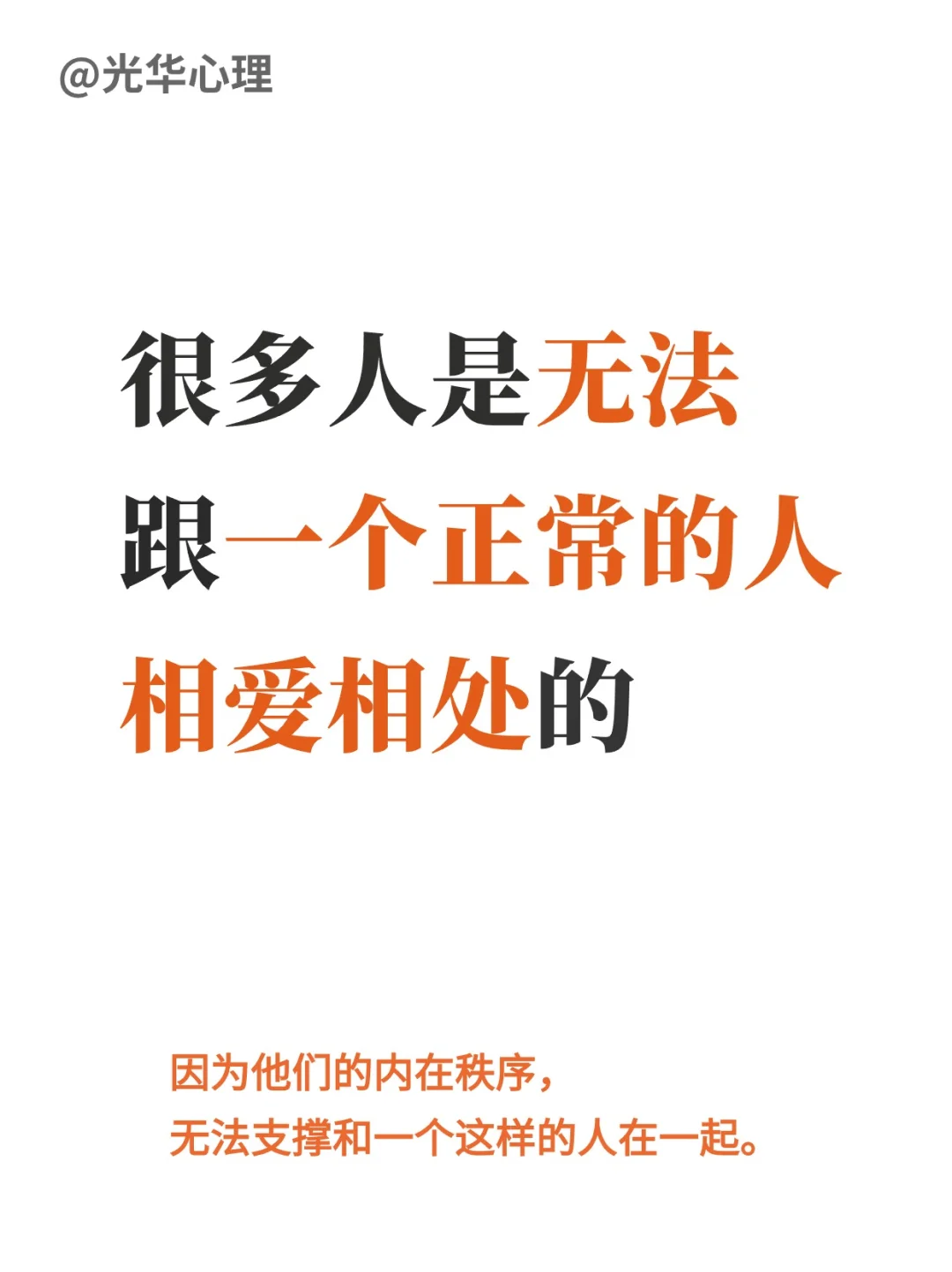 其实,跟一个各方面都相对正常的人相爱相处,并不是一件容易的事。这里的难不在于筛选,而是大部分人的内在秩序,无法支撑跟一个这样的人在一起。