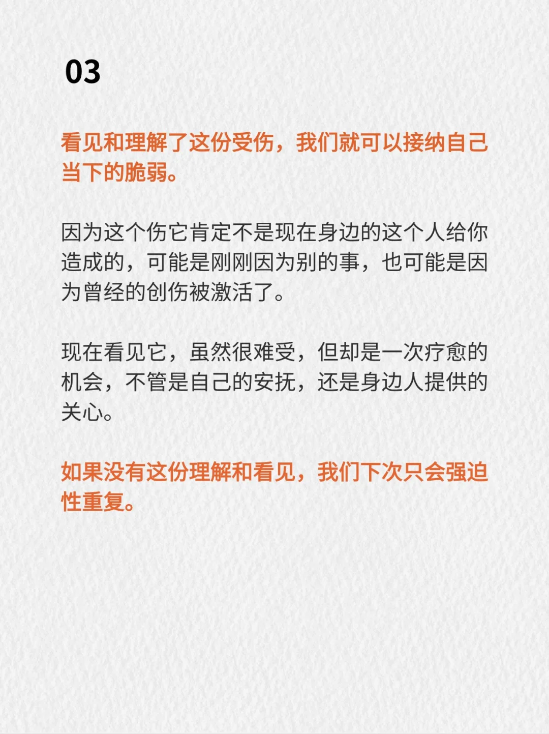 因为这个伤它肯定不是现在身边的这个人给你造成的,可能是刚刚因为别的事,也可能是因为曾经的创伤被激活了。现在看见它,虽然很难受,但却是一次疗愈的机会,不管是自己的安抚,还是身边人提供的关心。