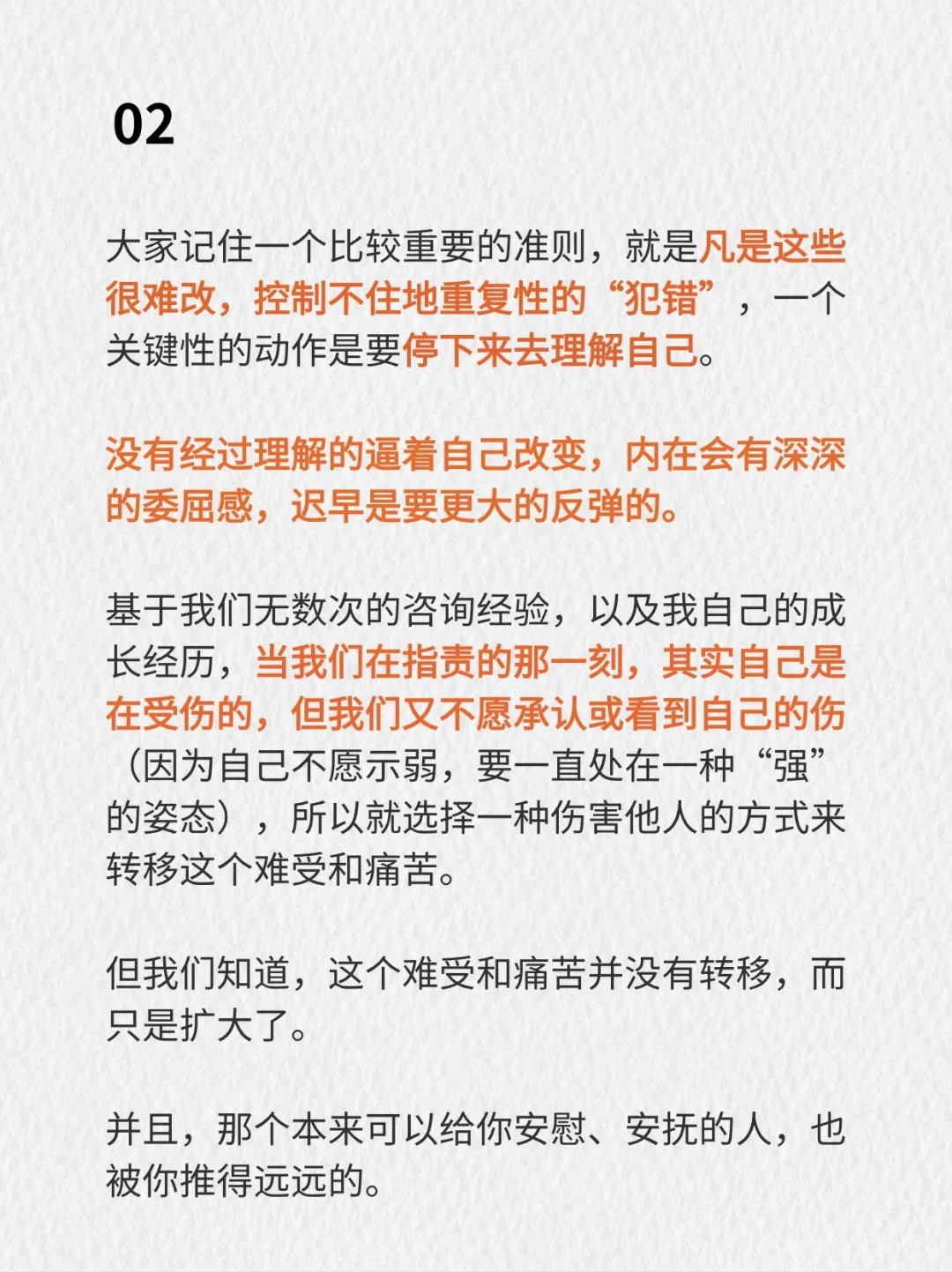 大家记住一个比较重要的准则,就是凡是这些很难改,控制不住地重复性的“犯错”,一个关键性的动作是要停下来去理解自己。