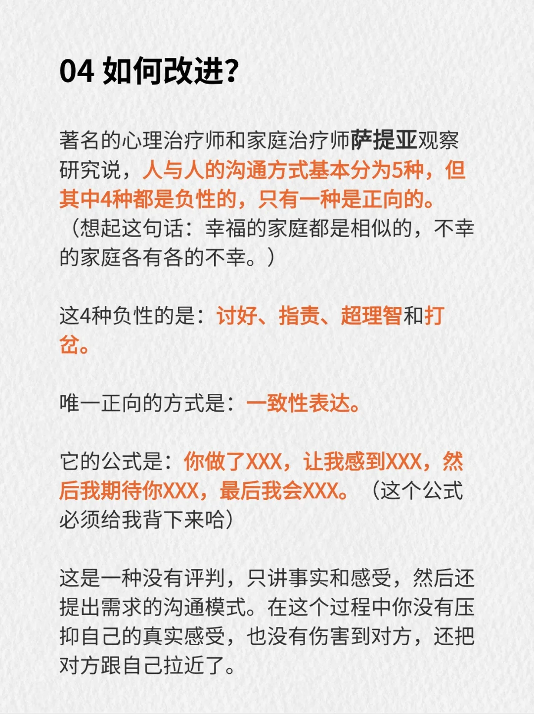 著名的心理治疗师和家庭治疗师萨提亚观察研究说,人与人的沟通方式基本分为5种,但其中4种都是负性的,只有一种是正向的。(想起这句话:幸福的家庭都是相似的,不幸的家庭各有各的不幸。)