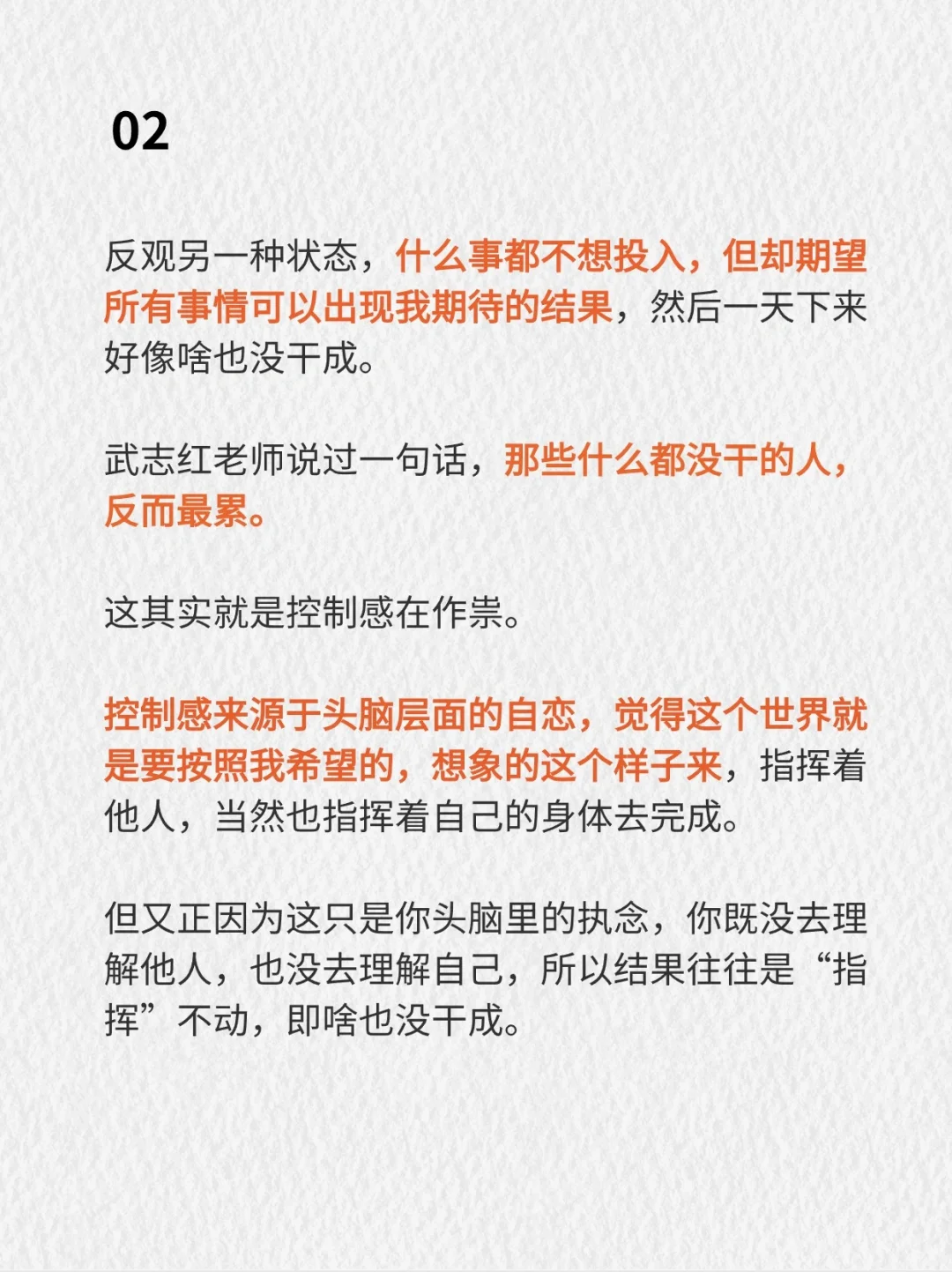 控制感来源于头脑层面的自恋,觉得这个世界就是要按照我希望的,想象的这个样子来,指挥着他人,当然也指挥着自己的身体去完成。