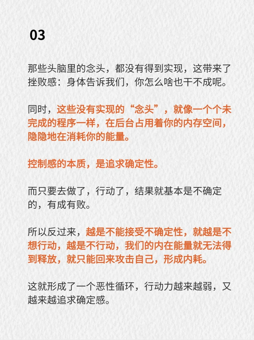 而只要去做了,行动了,结果就基本是不确定的,有成有败。所以反过来,越是不能接受不确定性,就越是不想行动,越是不行动,我们的内在能量就无法得到释放,就只能回来攻击自己,形成内耗。