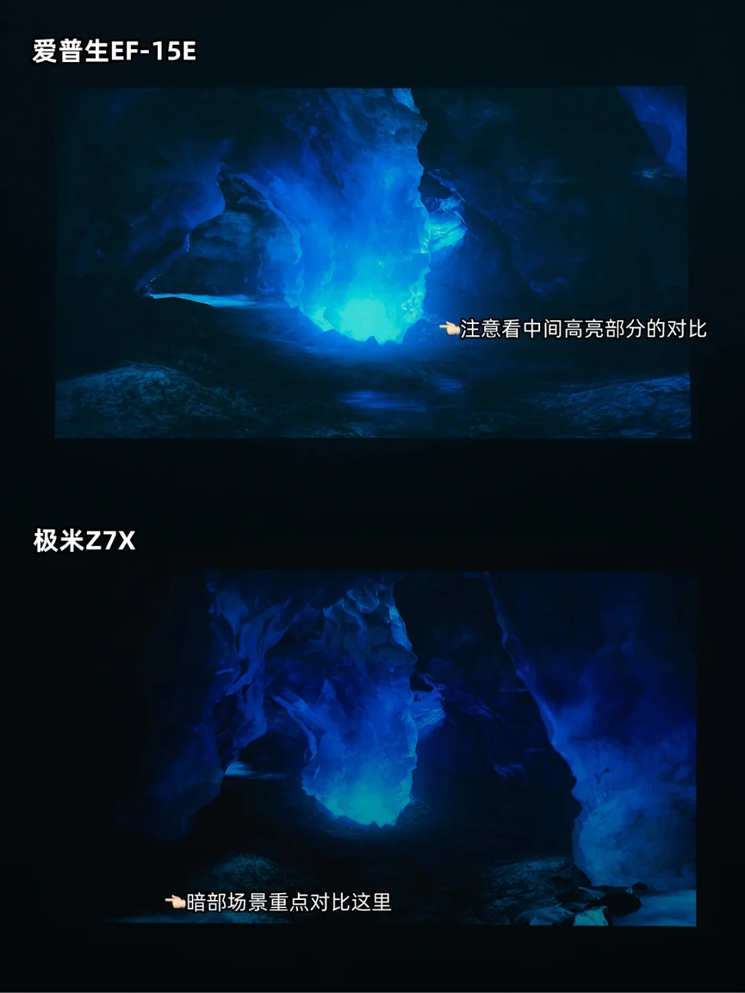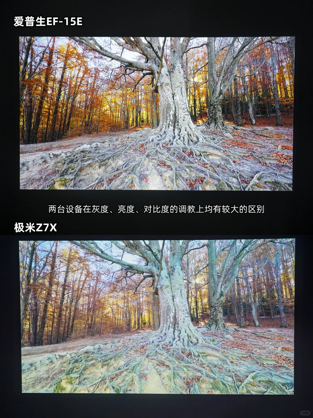 亮度够高,才能看清画面细节。根据ISO流明标准,爱普生EF-15E 750 ISO流明,极米Z7X则达到了900CVIA流明。数据来看Z7X略高,但二者亮度单位不同,ISO是国际标准,CVIA是国内标准。我们直接看实拍图吧,实际的亮度场景表现见图。