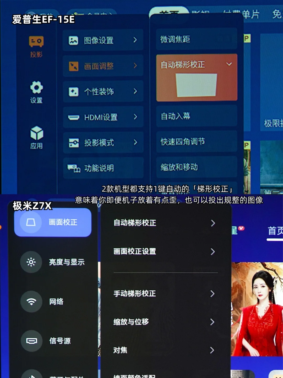 2台机器都有智能系统,也都都支持「自动画面校正」的功能,爱普生机身底部带一个可调节支脚,极米Z7X可以额外购买一个可旋转支架。