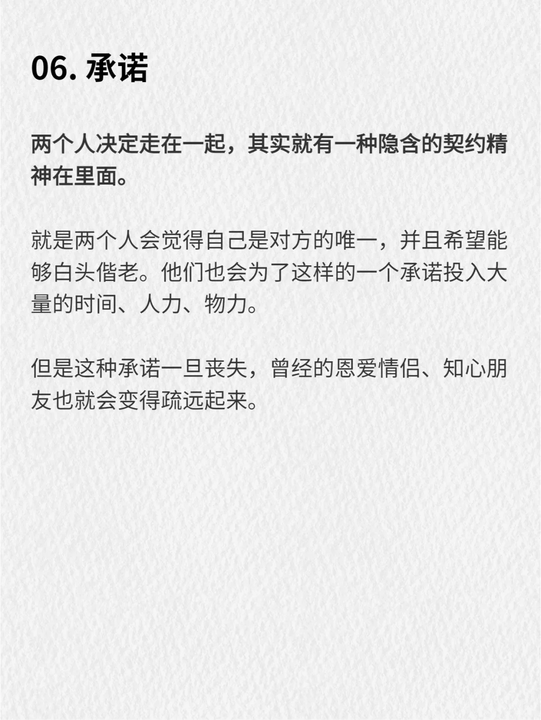 但是这种承诺一旦丧失,曾经的恩爱情侣、知心朋友也就会变得疏远起来。