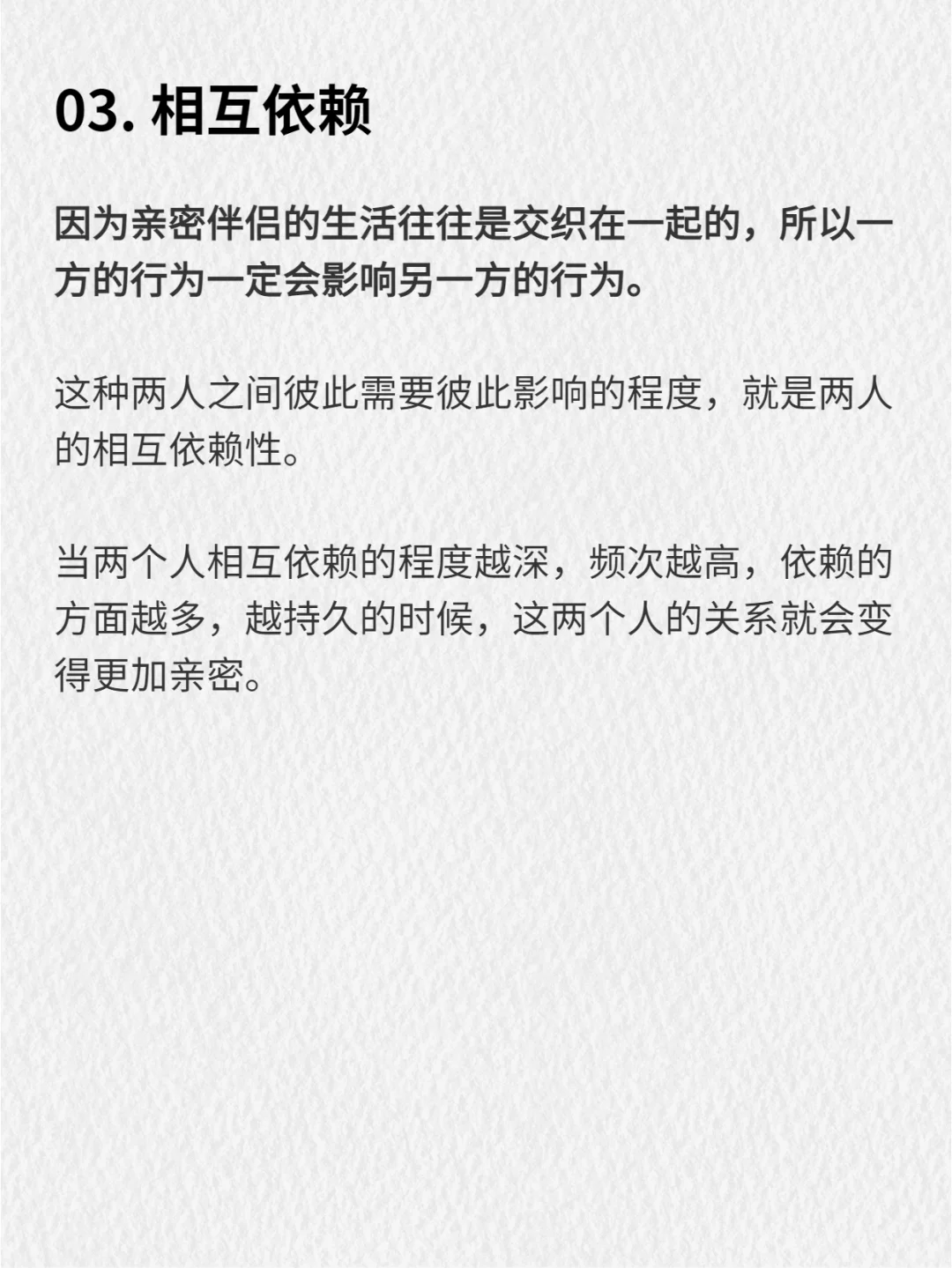 当两个人相互依赖的程度越深,频次越高,依赖的方面越多,越持久的时候,这两个人的关系就会变得更加亲密。