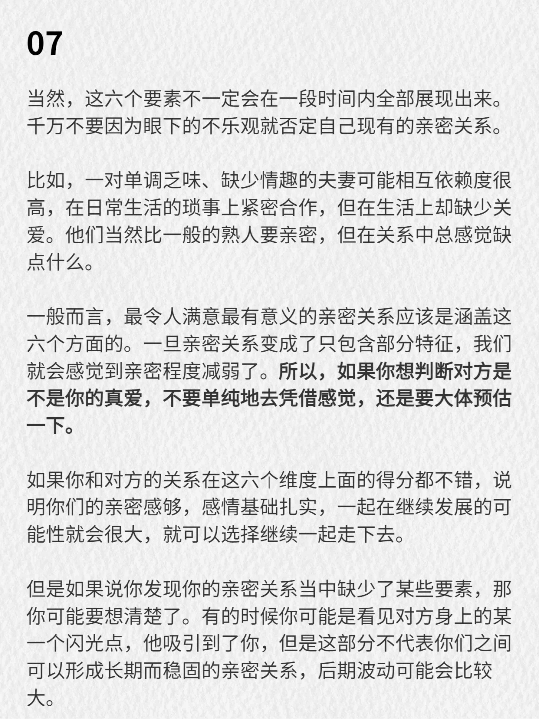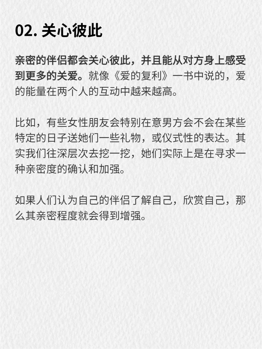 亲密的伴侣都会关心彼此,并且能从对方身上感受到更多的关爱。就像《爱的复利》一书中说的,爱的能量在两个人的互动中越来越高。