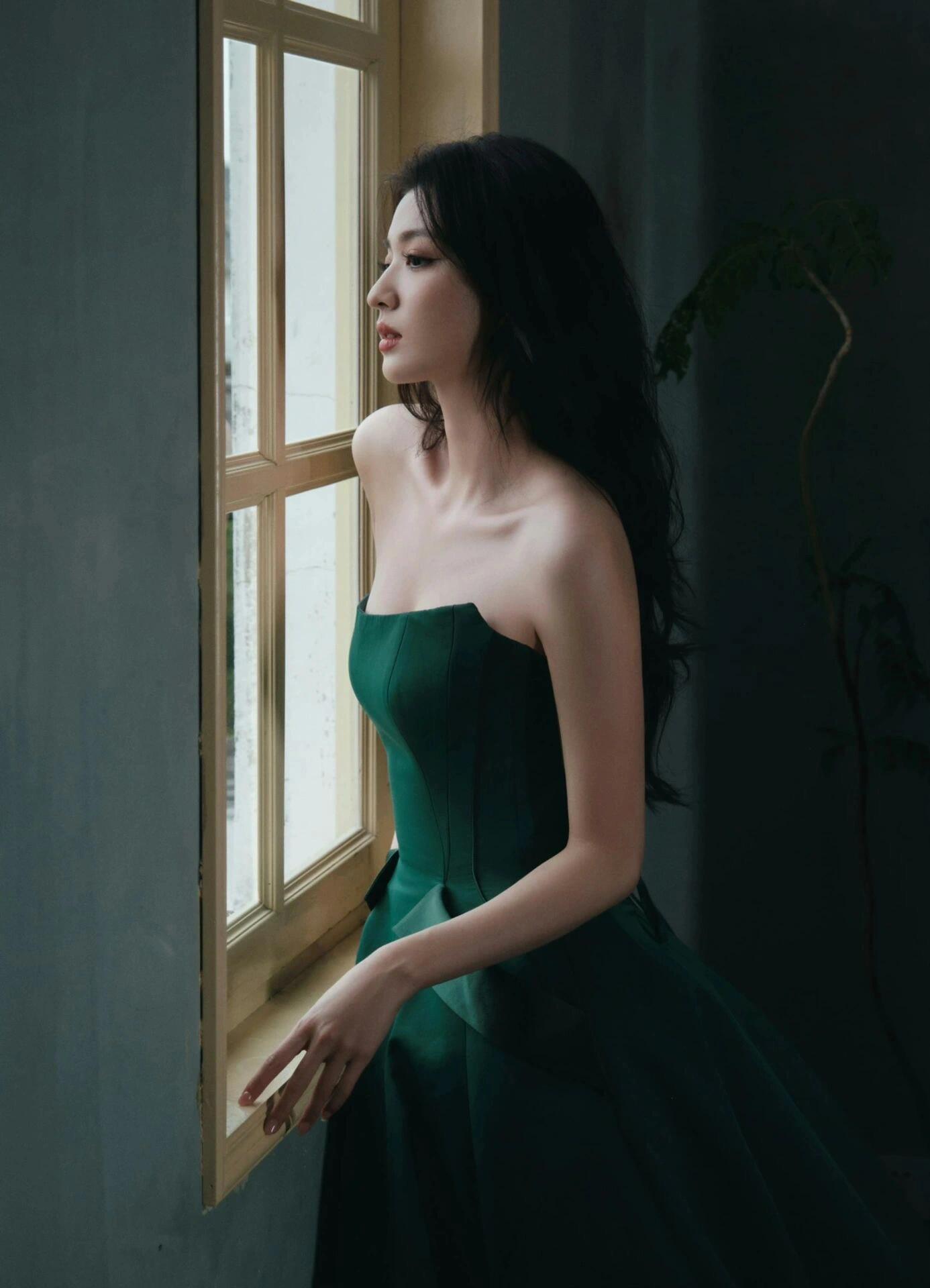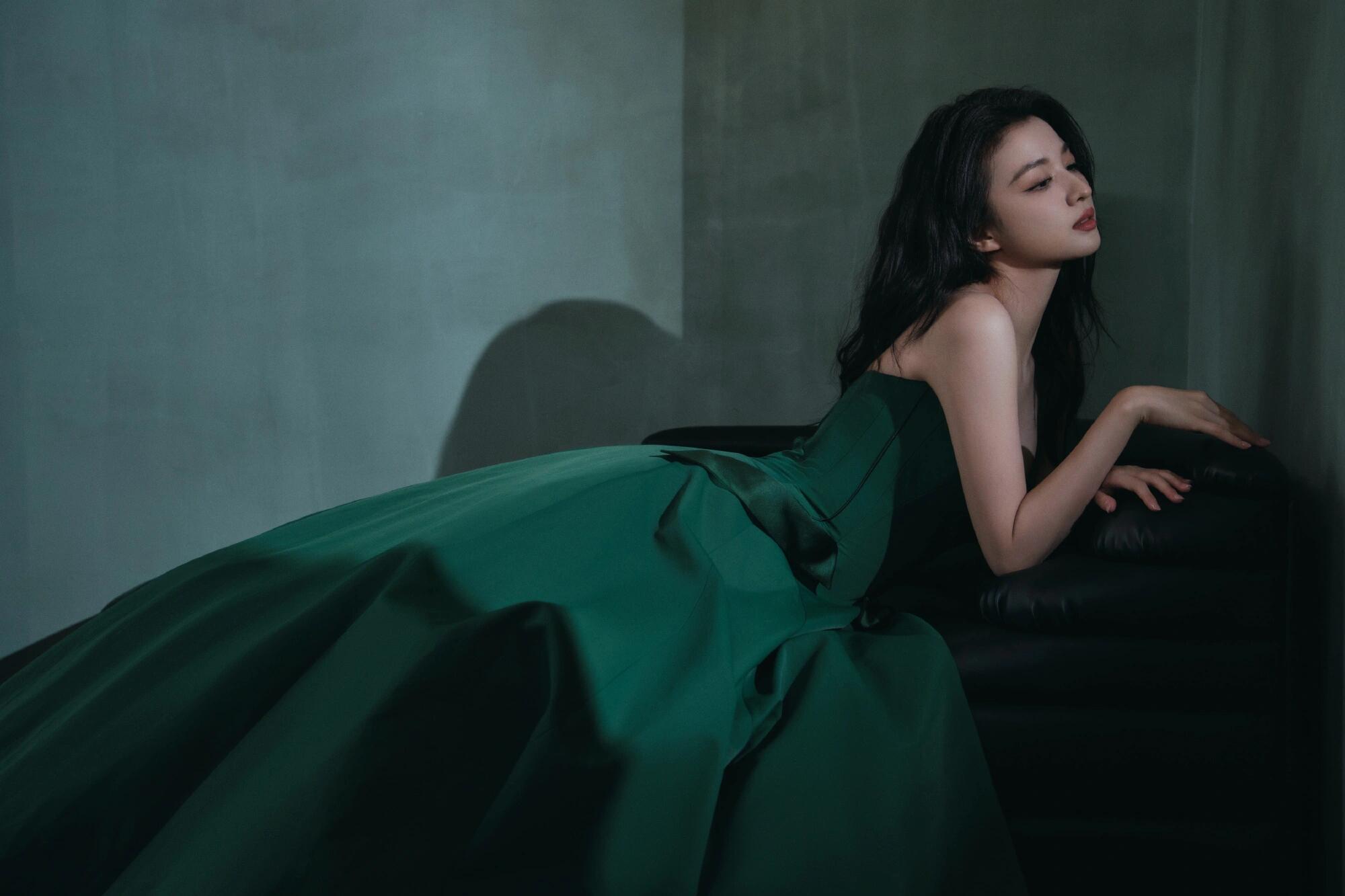 王楚然的静谧写真,绿色晚礼服显得好有气质,高个女生穿起来更显冷艳