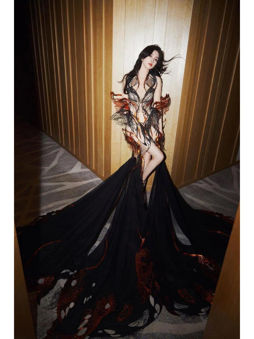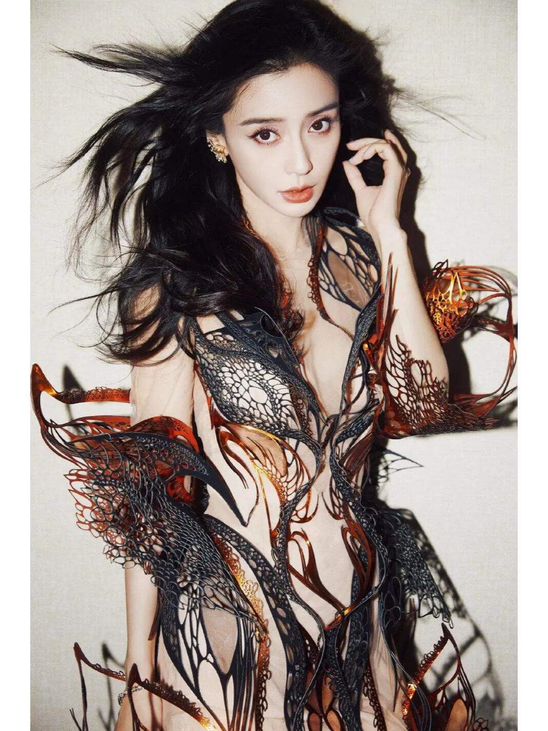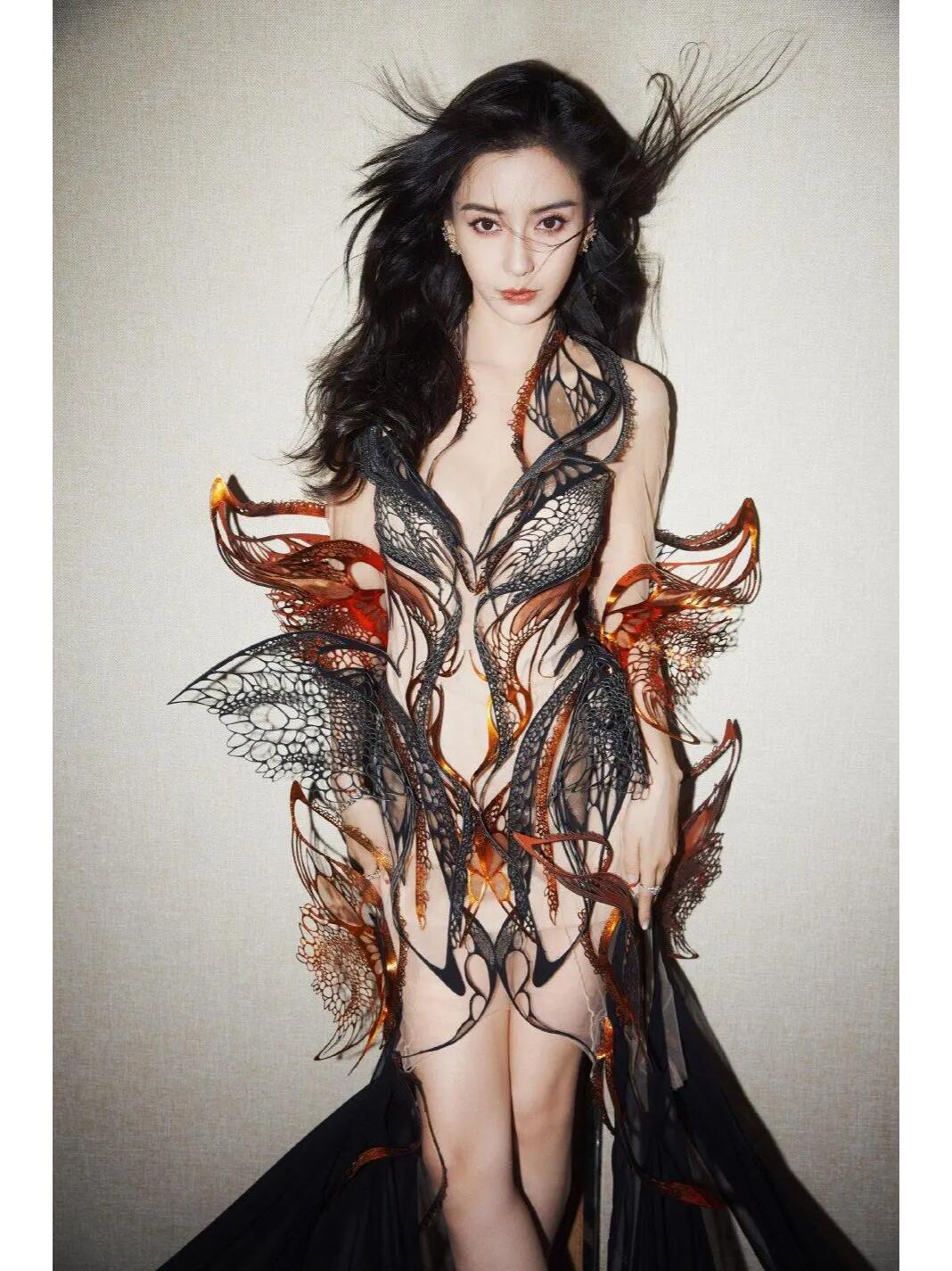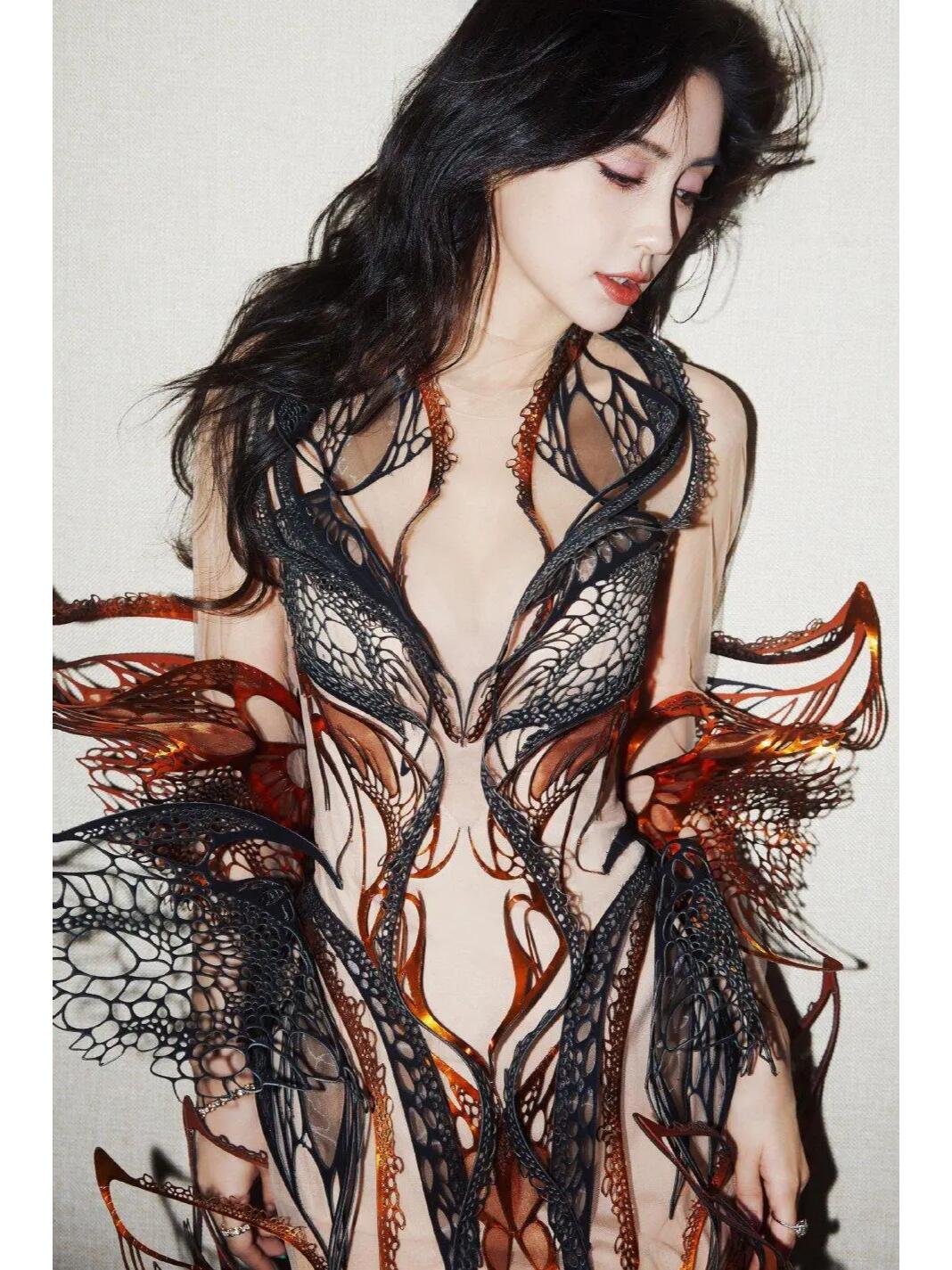 杨颖身穿一件薄翼鎏金裙,裙摆如同烈焰般飘扬,给人一种炫目的视觉冲击。她的头发也染成了金色,与裙子相呼应,更显高贵和华丽。她的妆容也很大胆,眼影和唇彩都是鲜艳的红色,与她的肤色形成了强烈的对比,突出了她的五官和气质。她的眼神也很有神采,时而凝视镜头,时而低垂眼帘,展现了不同的表情和情绪。整组写真给人一种先锋大胆的时尚感,也展现了杨颖作为女性的魅力和自信。