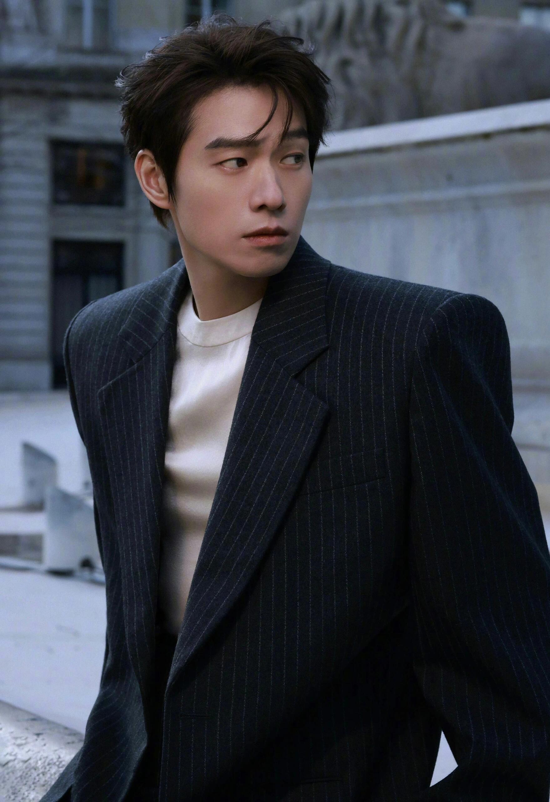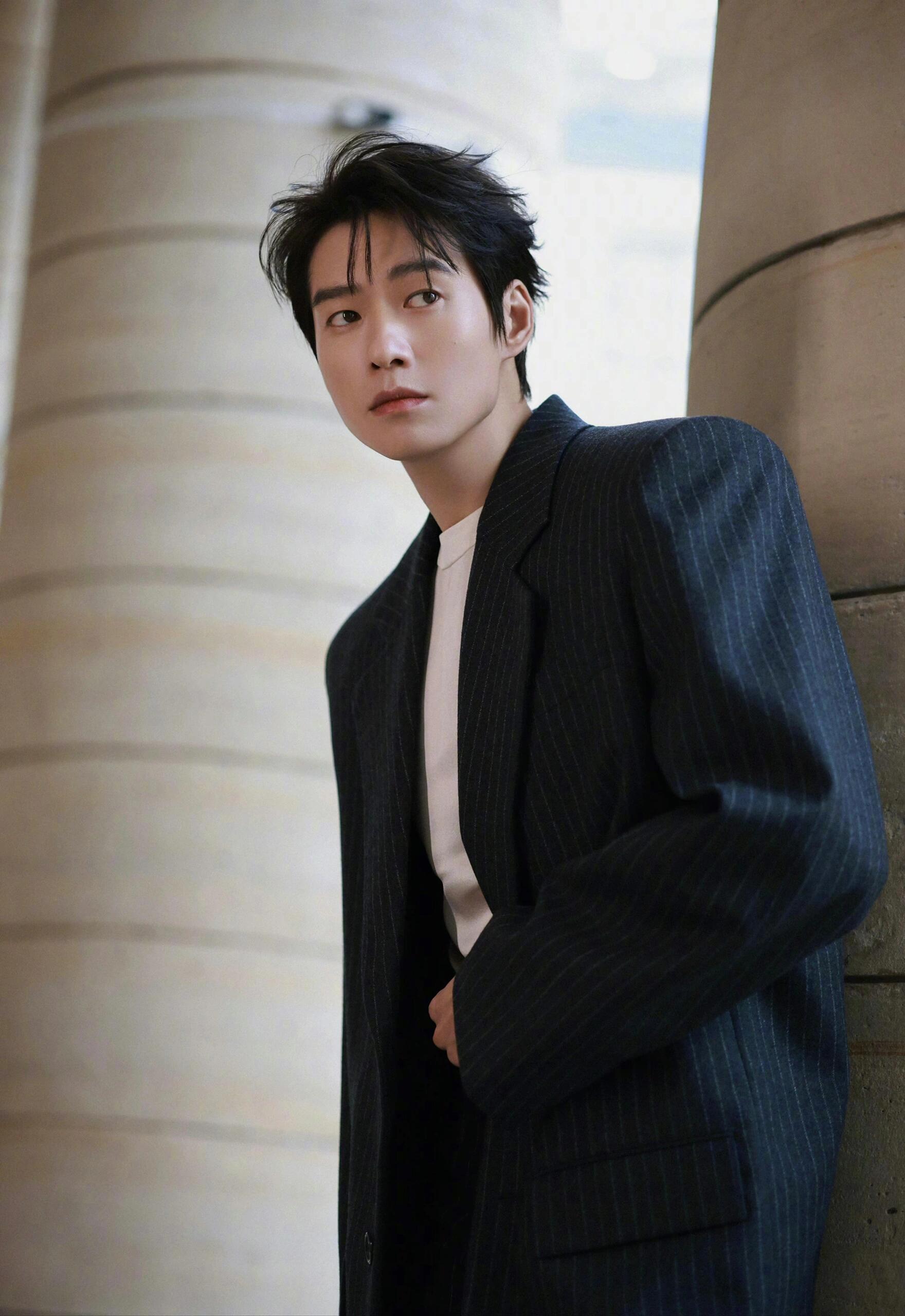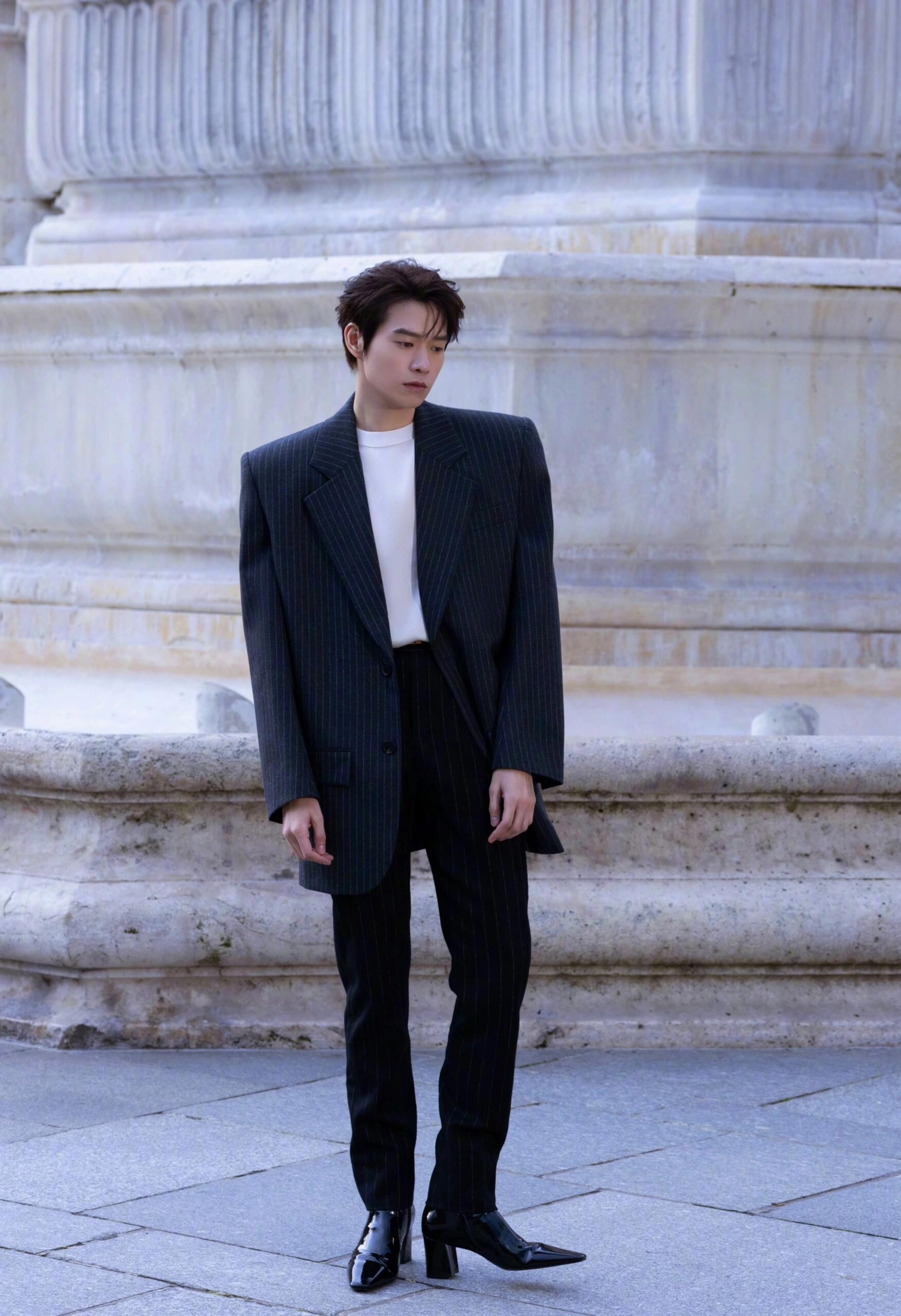 魏大勋造型片图集,条纹西装搭配高跟靴,利落时髦气场,巴黎街头邂逅,为时装周之行划下完美句点