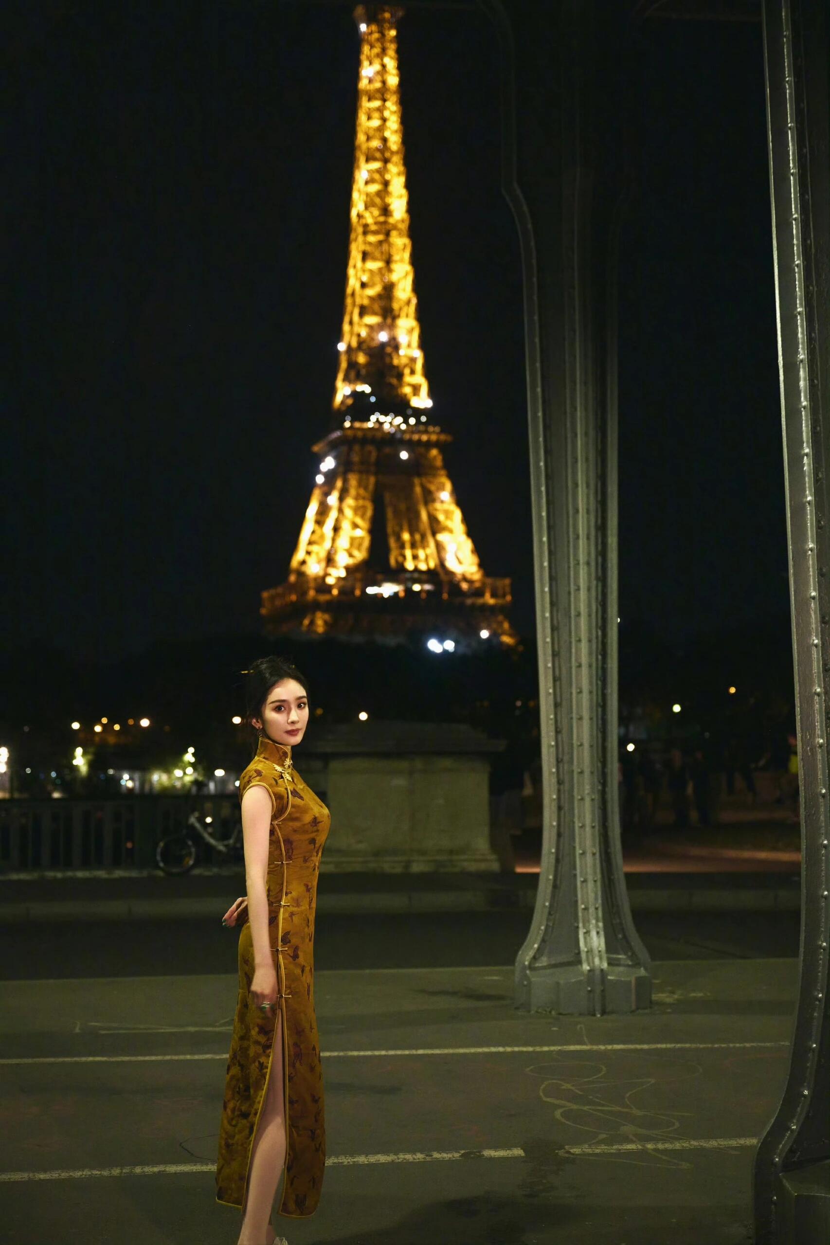 杨幂穿旗袍,巴黎街头成东方画卷,国风美震撼外媒,这热度,内地明星的国际范儿啊