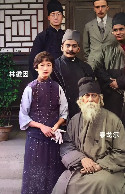 1924年,林徽因、徐志摩与印度诗人泰戈尔的真实合影,也是他们的真实相貌。镜头下的泰戈尔身穿素色长袍,留着白色的胡须,一副仙风道骨的模样。林徽因身穿传统服饰,端庄大方,徐志摩英俊儒雅,一副书生的打扮。 泰戈尔来华前,就提出聘请徐志摩担任翻译。二人关系深厚密切,徐志摩亲切地称泰戈尔为“老戈爹”。泰戈尔也深知徐志摩为情所困,甚至自告奋勇"撮合"过徐志摩与林徽因二人,只可惜二人有缘无分。