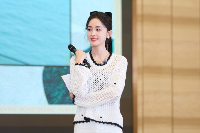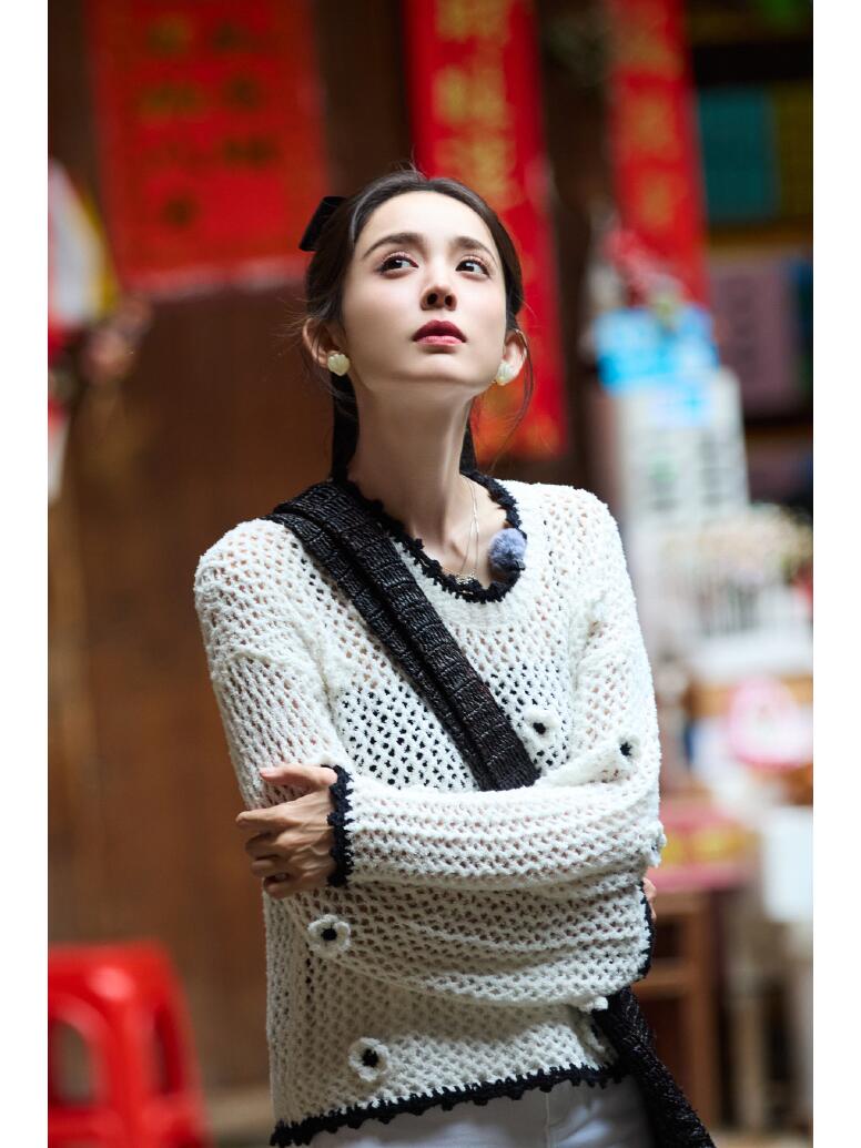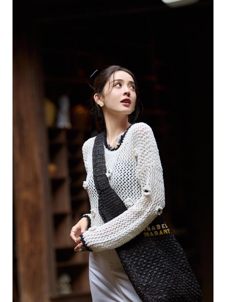 她穿了一件白色的网眼针织衫,透气时尚又凉爽,夏天穿这样的网眼针织衫还是不错的。