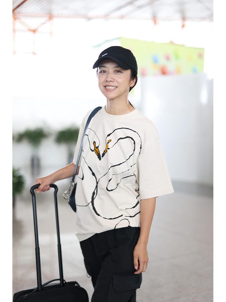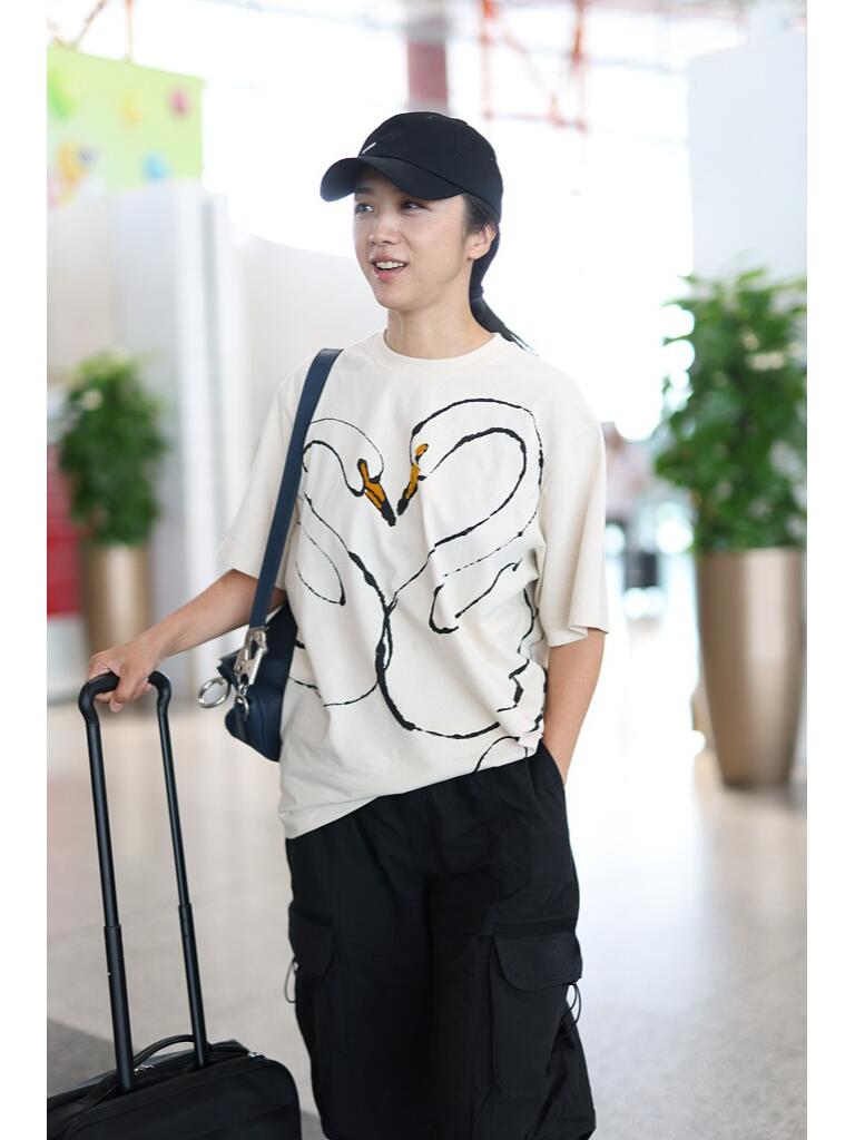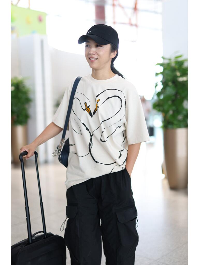 她穿了一件白色的圆领宽松T恤,T恤胸前还有黑色的线条印花,时尚不单调。她搭配了一条黑色的宽松裤子。