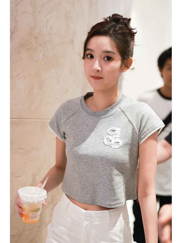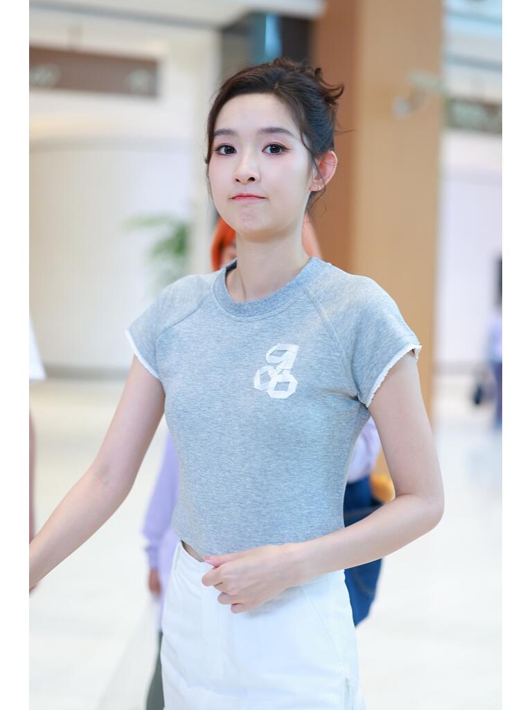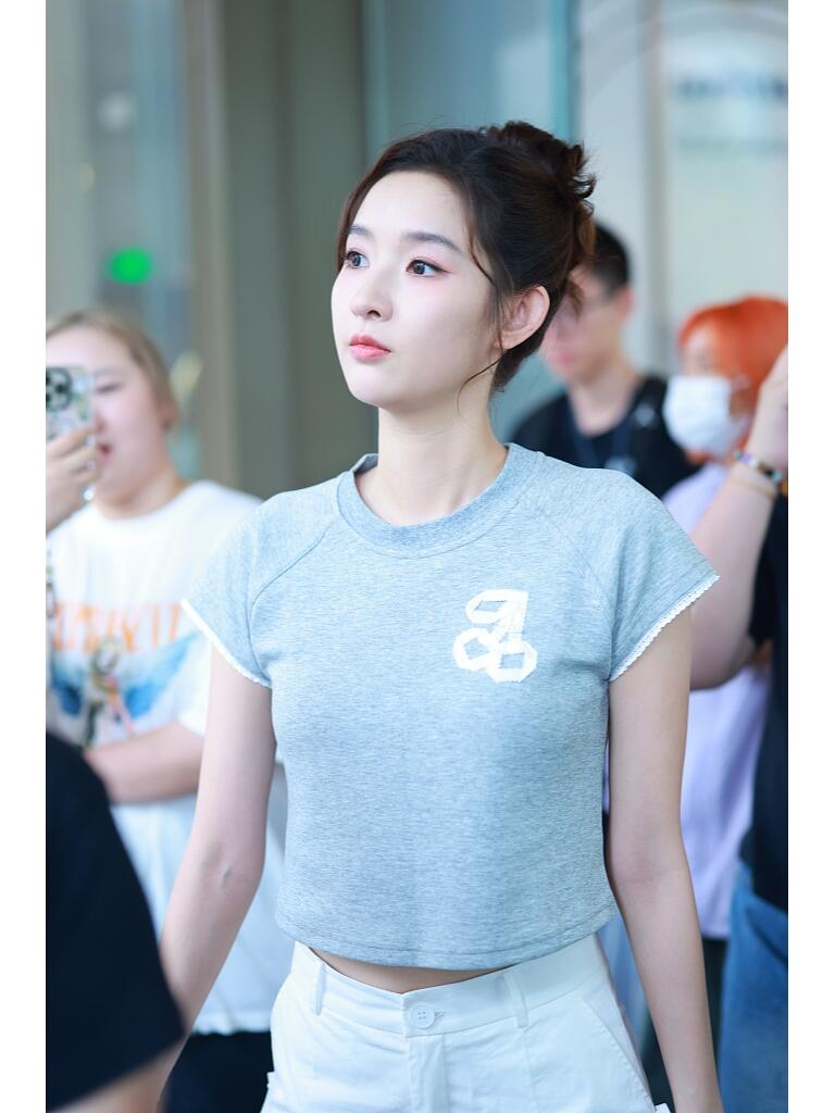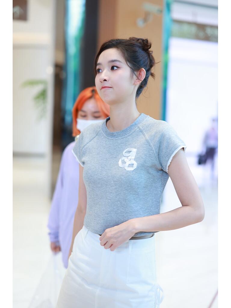 她把头发盘起来,甜美利落,她穿了一件浅蓝色的短款露腰T恤,搭配一条白色的小短裙,脚上穿灰色袜子和小白鞋。简单时髦有个性。好看又青春的一套夏日穿搭。