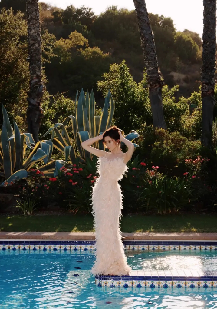 文咏珊晒夏日泳池大片,她身穿羽毛抹胸裙站在泳池边上,状态自由松弛,身材超棒!