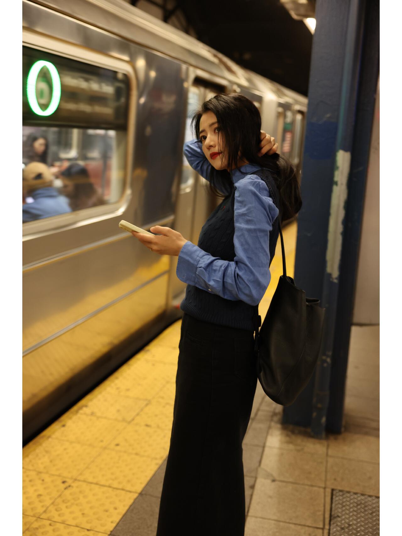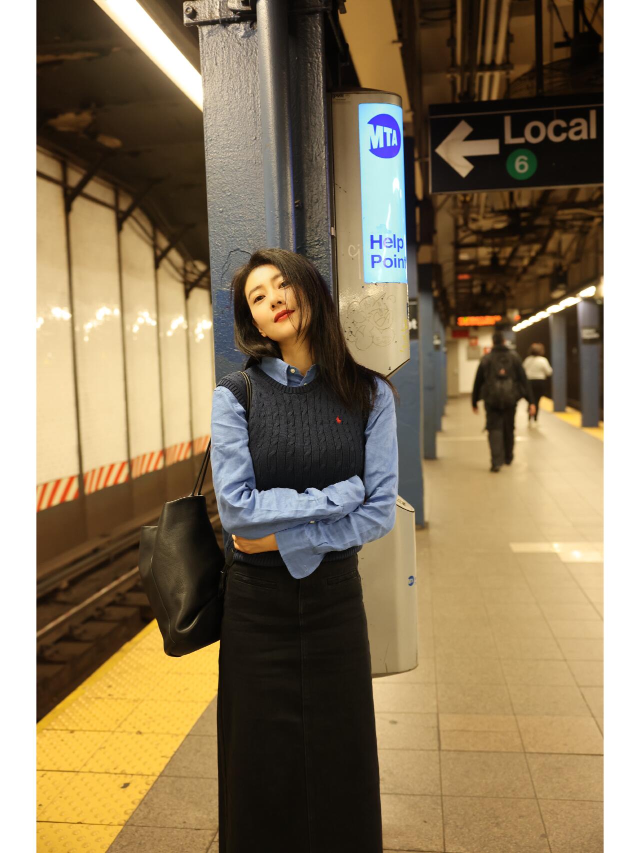 她穿了一件黑色的绞花圆领马甲,内搭一件蓝色的牛仔衬衫,搭配一条黑色的直筒长裙,简单大方又文艺。还有点学院风的感觉。