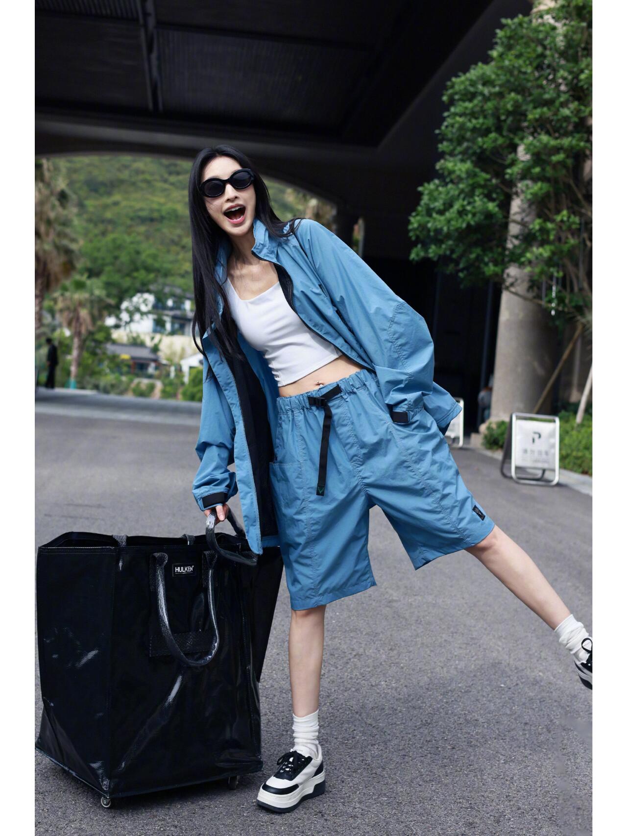 她穿了一件蓝色的牛仔衬衫,内搭配一件白色的露腰小背心,搭配一条蓝色的牛仔短裤,这裤子比较长一些,有点中裤的感觉。宽宽松松的,透气舒适,还有一份慵懒随性的感觉。脚上是短袜子加运动鞋。时尚休闲又有个性的夏日街头穿搭。